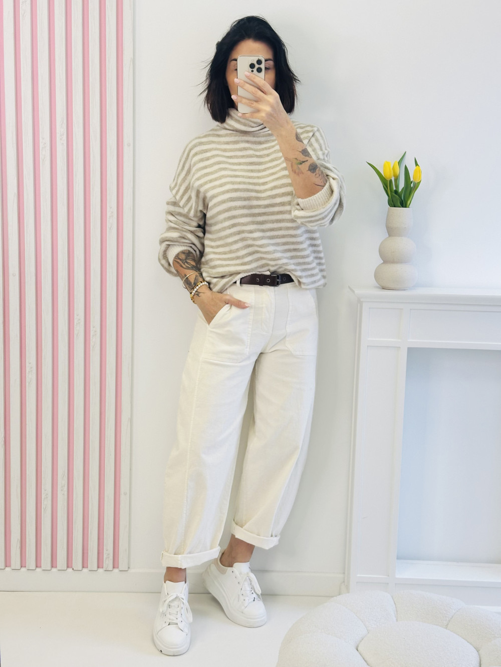 Sweter w paski multikolor z długim rękawem i golfem to połączenie wygody, koloru i modnego stylu. Miękki, przyjemny w dotyku materiał otula sylwetkę, zapewniając komfort noszenia nawet w chłodniejsze dni. Kolorowe pasy nadają mu energii i charakteru, a golf subtelnie podkreśla szyję, tworząc stylowy i nowoczesny look.