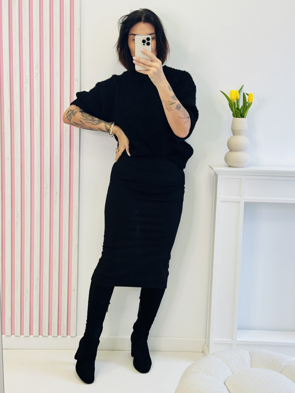 Czarny sweter z krótkim rękawem to klasyczna i uniwersalna propozycja, która łączy elegancję z wygodą. Miękki, przyjemny w dotyku materiał zapewnia komfort noszenia, a prosty krój sprawia, że sweter doskonale komponuje się z różnorodnymi stylizacjami. Idealny zarówno na co dzień, jak i do bardziej stylowych, casualowych zestawów.