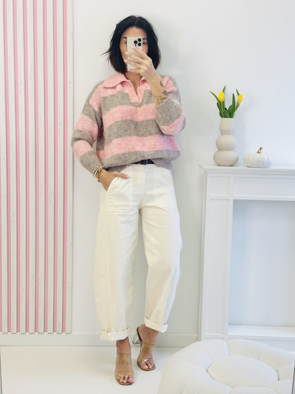Różowo-szary sweter z długim rękawem to elegancka i subtelna propozycja, która łączy w sobie komfort i styl. Kołnierzyk dodaje całości klasycznego uroku i delikatnie podkreśla szyję, tworząc kobiecy i wyrafinowany wygląd. Wykonany z miękkiego, przyjemnego w dotyku materiału, zapewnia wygodę noszenia i doskonale sprawdzi się w codziennych oraz bardziej eleganckich stylizacjach.
