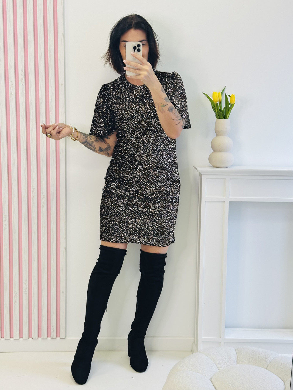Sukienka z krótkim rękawem ozdobiona cekinami to efektowna propozycja, która przyciąga spojrzenia i dodaje blasku każdej stylizacji. Delikatny połysk cekinów subtelnie podkreśla elegancję, tworząc wyjątkowy, kobiecy look. Wykonana z przyjemnego w dotyku materiału, zapewnia komfort noszenia, sprawdzając się idealnie na wyjątkowe okazje i wieczorne wyjścia.