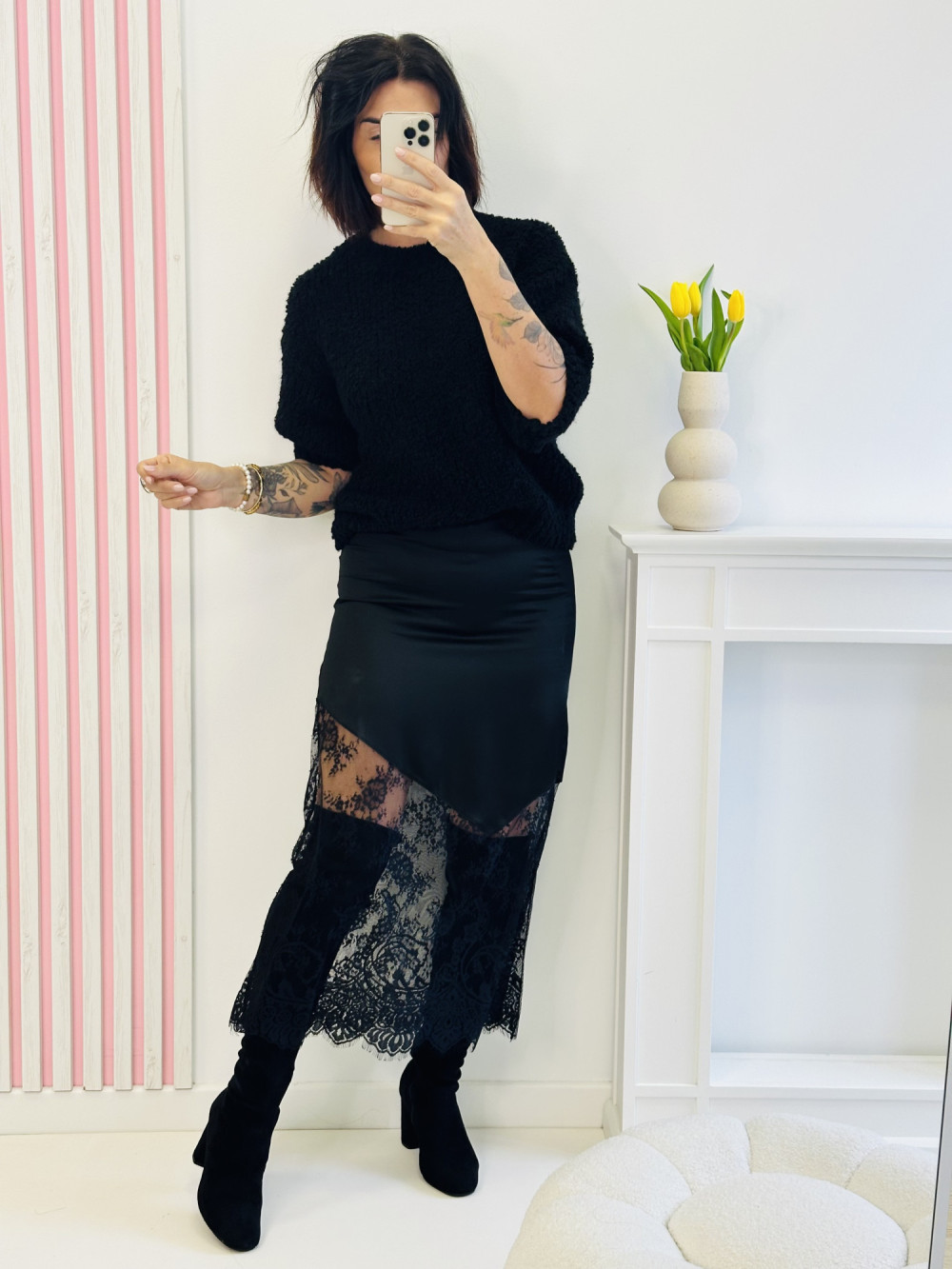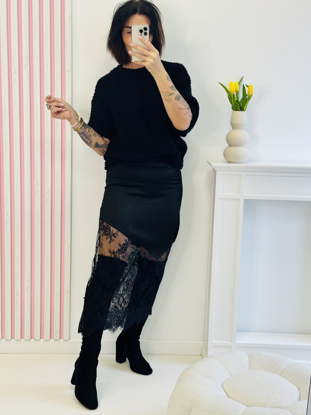 Czarna spódnica z gumką w pasie oraz koronkowym dołem to elegancka i kobieca propozycja na każdą okazję. Gumka w talii zapewnia wygodne dopasowanie, a delikatna koronka u dołu dodaje lekkości i subtelnego uroku. Wykonana z miękkiego, przyjemnego w dotyku materiału, łączy komfort noszenia z wyjątkowym stylem, idealnym zarówno na co dzień, jak i na wieczorne wyjścia.