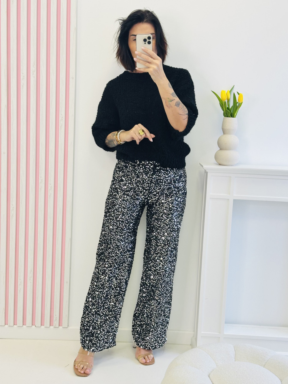 Czarne, cekinowe spodnie z gumką w pasie to efektowna propozycja, która łączy wygodę z odrobiną blasku. Gumka w talii zapewnia komfort i idealne dopasowanie, a subtelny połysk cekinów dodaje stylizacji elegancji i wyjątkowego charakteru. Wykonane z miękkiego, przyjemnego w dotyku materiału, sprawdzą się doskonale zarówno na wieczorne wyjścia, jak i wyjątkowe okazje.