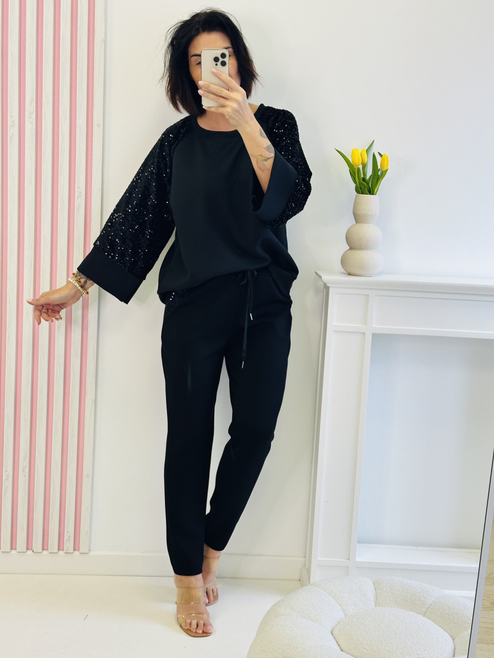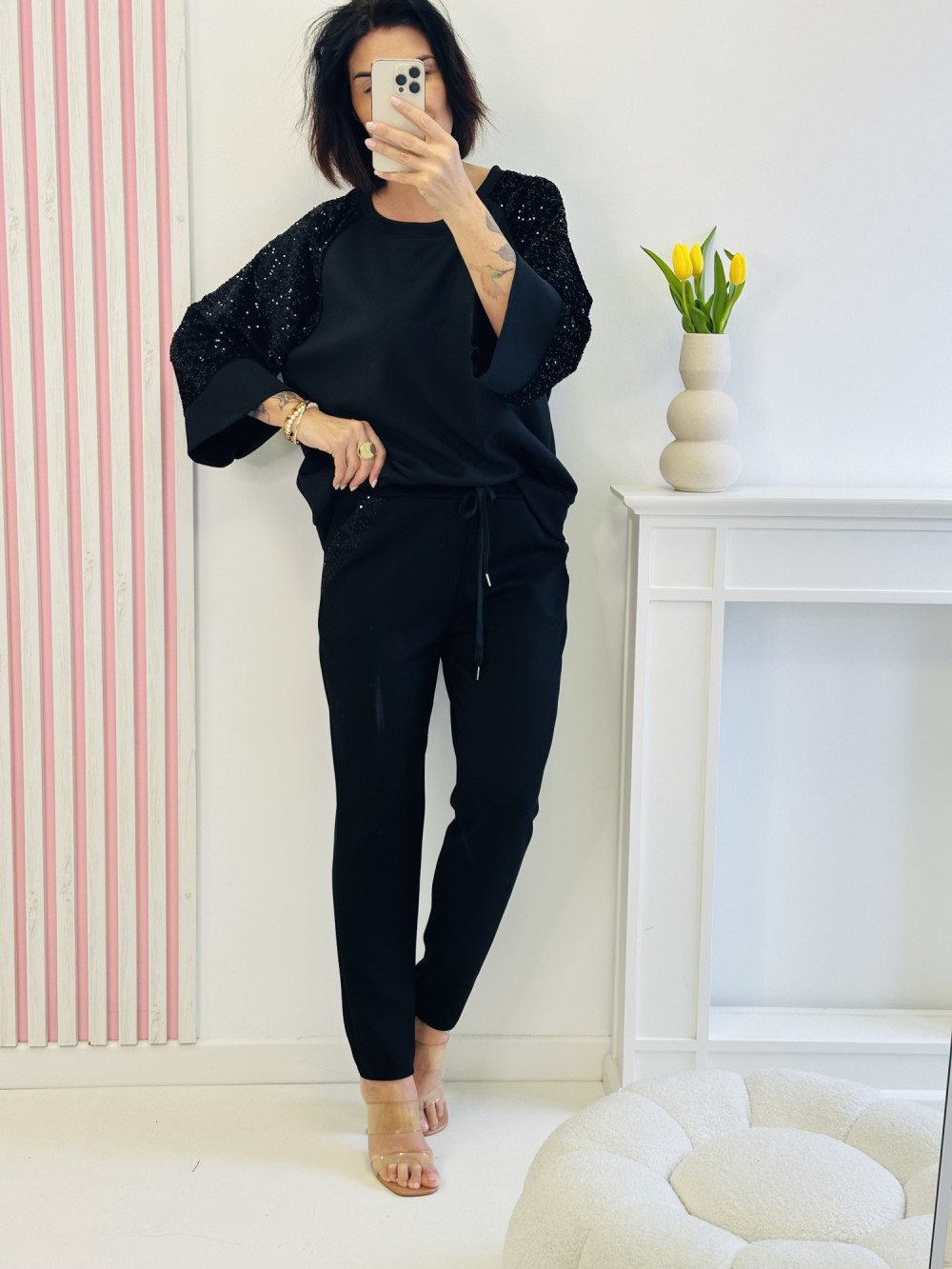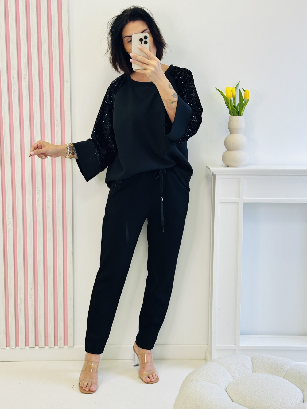 Czarny komplet z bluzą z długim rękawem i spodniami to połączenie wygody i efektownego stylu. Bluza zdobiona cekinami na rękawach dodaje całości subtelnego blasku, a spodnie z gumką w pasie, kieszeniami i cekinowymi akcentami podkreślają modny charakter zestawu. Miękki, przyjemny w dotyku materiał zapewnia komfort noszenia, sprawiając, że komplet idealnie sprawdzi się zarówno na wyjątkowe okazje, jak i stylowe wyjścia na co dzień.