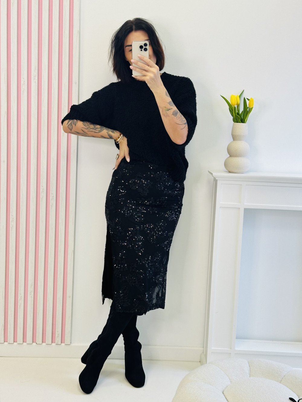 Czarna spódnica z kryształkami, gumką w pasie i podszewką to elegancka propozycja, która łączy wygodę z subtelnym blaskiem. Gumka w talii zapewnia idealne dopasowanie, a delikatne kryształki nadają spódnicy wyjątkowego charakteru. Dzięki miękkiej podszewce spódnica jest komfortowa w noszeniu, sprawdzając się zarówno w codziennych, jak i bardziej wyjątkowych, wieczorowych stylizacjach.