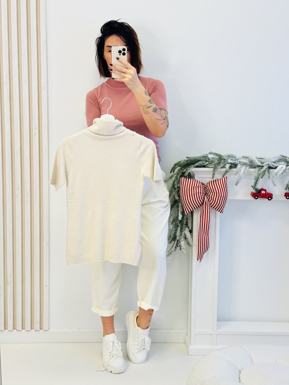 Sweter z golfem i krótkim rękawem to stylowa propozycja łącząca elegancję z nowoczesnym charakterem. Delikatny golf dodaje całości szyku, a krótkie rękawy sprawiają, że model doskonale sprawdzi się o każdej porze roku. Wykonany z miękkiego, przyjemnego w dotyku materiału, zapewnia komfort noszenia i świetnie komponuje się zarówno z eleganckimi spodniami, jak i spódnicą.