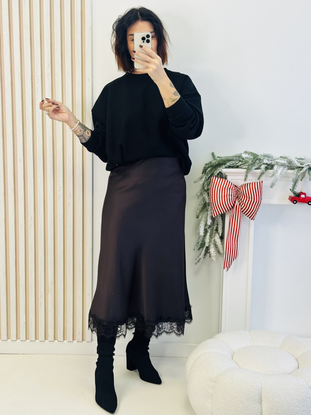 Czarna oversize bluza z długim rękawem to idealne połączenie wygody i nowoczesnego stylu. Luźny fason swobodnie układa się na sylwetce, zapewniając pełen komfort noszenia i modny, casualowy wygląd. Uniwersalny kolor sprawia, że bluza doskonale komponuje się z wieloma stylizacjami – od sportowych po bardziej miejskie.