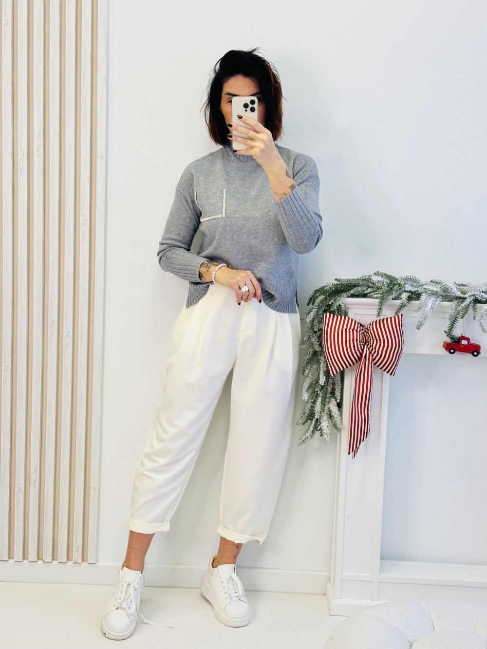 Stylowy sweter z długim rękawem i półgolfem to połączenie elegancji i wygody na co dzień. Z przodu znajduje się praktyczna kieszeń ozdobiona srebrnym detalem, który dodaje całości subtelnego blasku i nowoczesnego charakteru. Idealny do casualowych i bardziej szykownych stylizacji, zapewnia komfort oraz modny wygląd przez cały dzień.