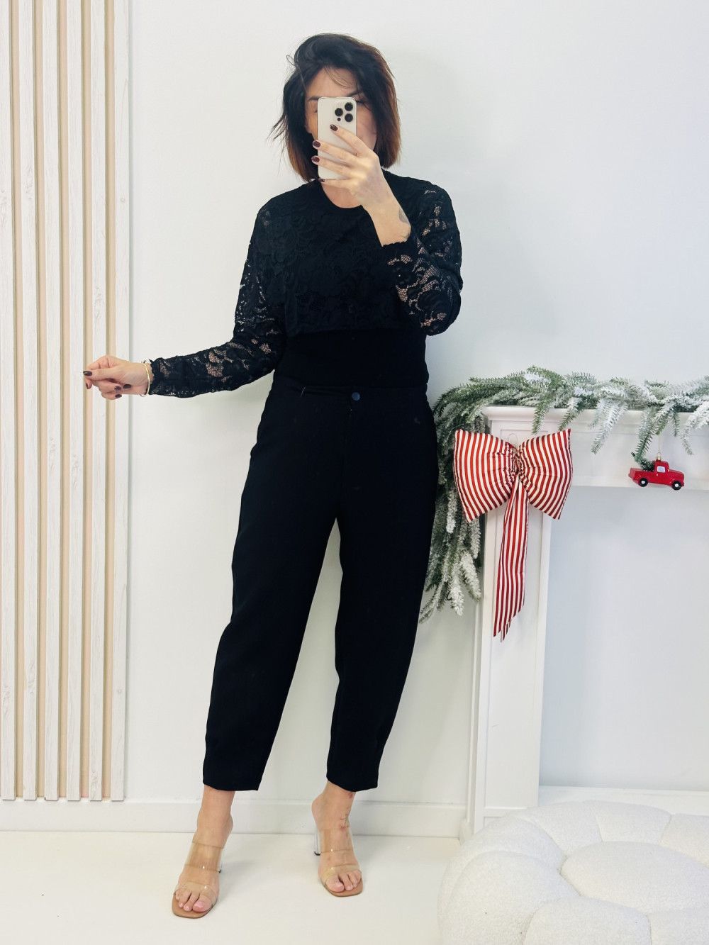 Czarna bluzka z siateczkową górą to wyjątkowy model, który łączy elegancję z subtelną zmysłowością. Delikatna siateczka zdobiona czarnymi kwiatami tworzy efektowny, kobiecy akcent, pięknie podkreślając linię dekoltu i ramion. Lekka, przyjemna w noszeniu tkanina dopełnia całość, tworząc bluzkę idealną zarówno na wieczorne wyjścia, jak i stylowe codzienne zestawy.
