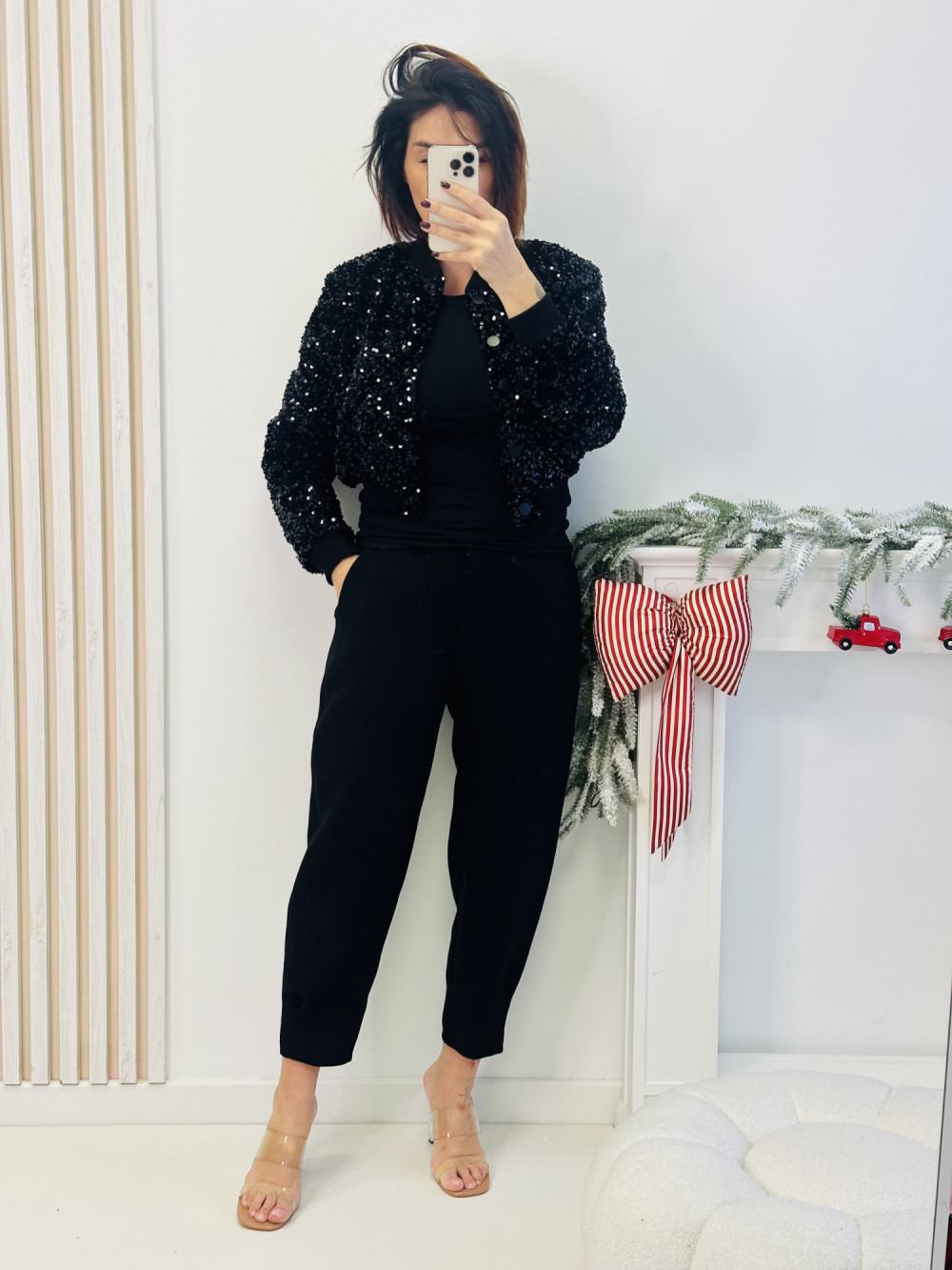 Cekinowa bomberka to efektowna propozycja, która doda blasku każdej stylizacji. Model z długim rękawem został w całości ozdobiony lśniącymi cekinami, dzięki czemu prezentuje się niezwykle stylowo i elegancko. Zapinana na guziki i wyposażona w praktyczne kieszenie, łączy w sobie wygodę oraz wyjątkowy, modowy charakter. Perfect na wyjątkowe okazje i wieczorne wyjścia.