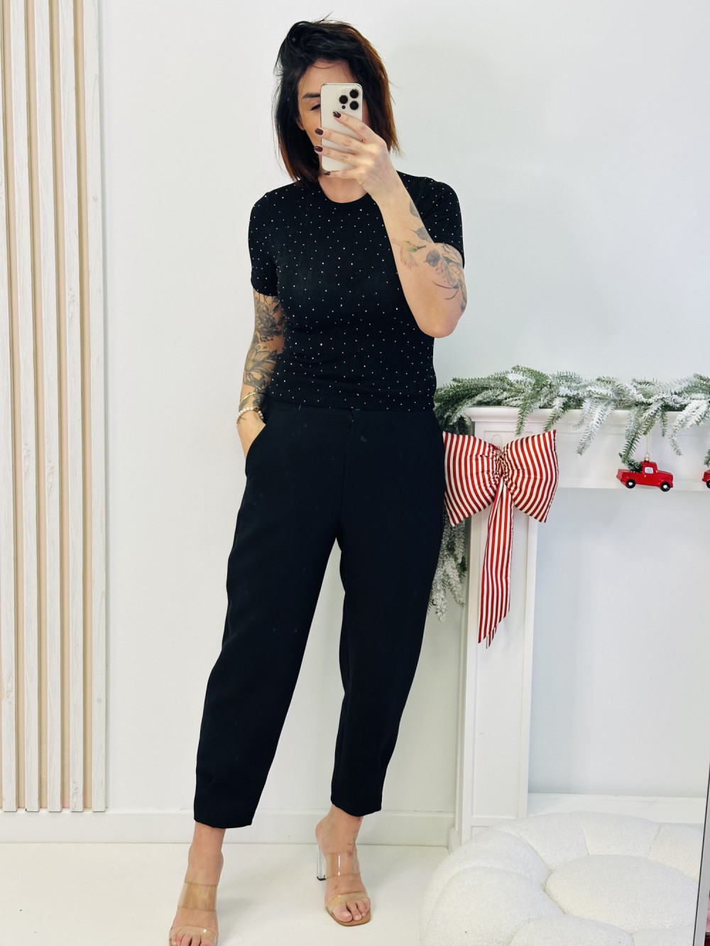 Czarna bluzka z krótkim rękawem to stylowa propozycja, która subtelnie łączy elegancję z delikatnym blaskiem. Jej powierzchnię zdobią drobne kryształki, dodające całości szykownego, ale nienachalnego efektu. Lekka tkanina i klasyczny fason sprawiają, że bluzka doskonale uzupełni zarówno codzienne, jak i bardziej wyjściowe stylizacje.