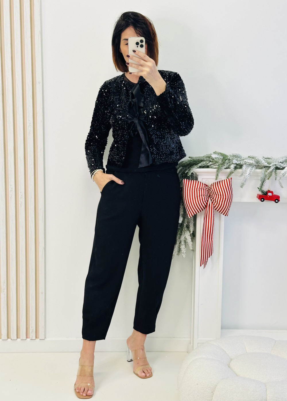 Czarna ala bomberka cekinowa to wyjątkowy element garderoby, który przyciąga wzrok eleganckim blaskiem. Model z długim rękawem pięknie mieni się przy każdym ruchu, dodając stylizacjom wieczorowego charakteru. Z przodu ozdobiona jest subtelnym wiązaniem, które nadaje całości kobiecego uroku i pozwala dopasować fason do sylwetki.