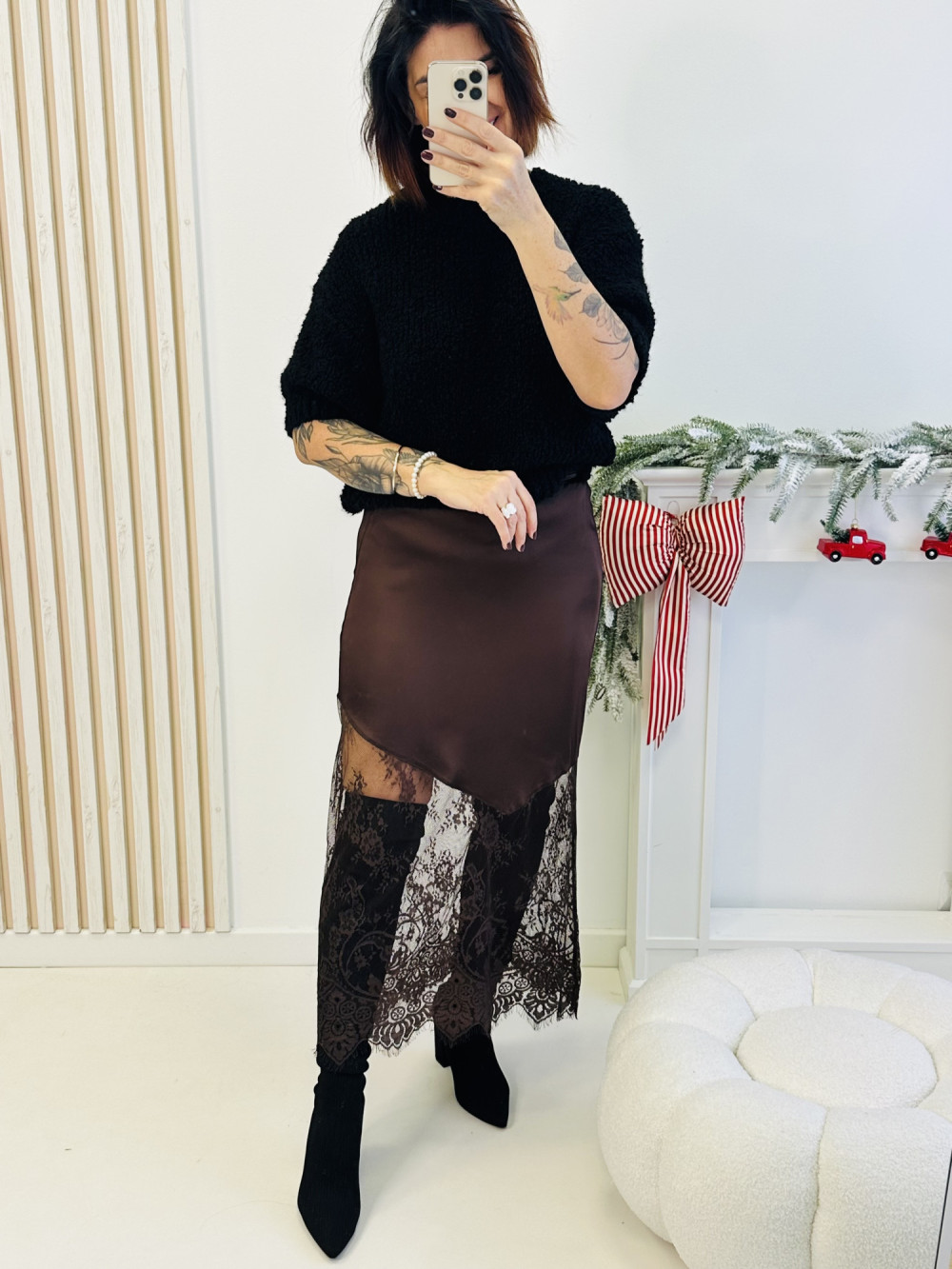 Brązowa spódnica z gumką w pasie i siateczkowym dołem to wyjątkowe połączenie komfortu i subtelnej elegancji. Elastyczna talia zapewnia wygodne dopasowanie, a lekkie, przewiewne wykończenie dodaje lekkości i delikatnego uroku. Stylowy fason sprawia, że spódnica doskonale sprawdzi się zarówno w codziennych, jak i bardziej eleganckich stylizacjach.
