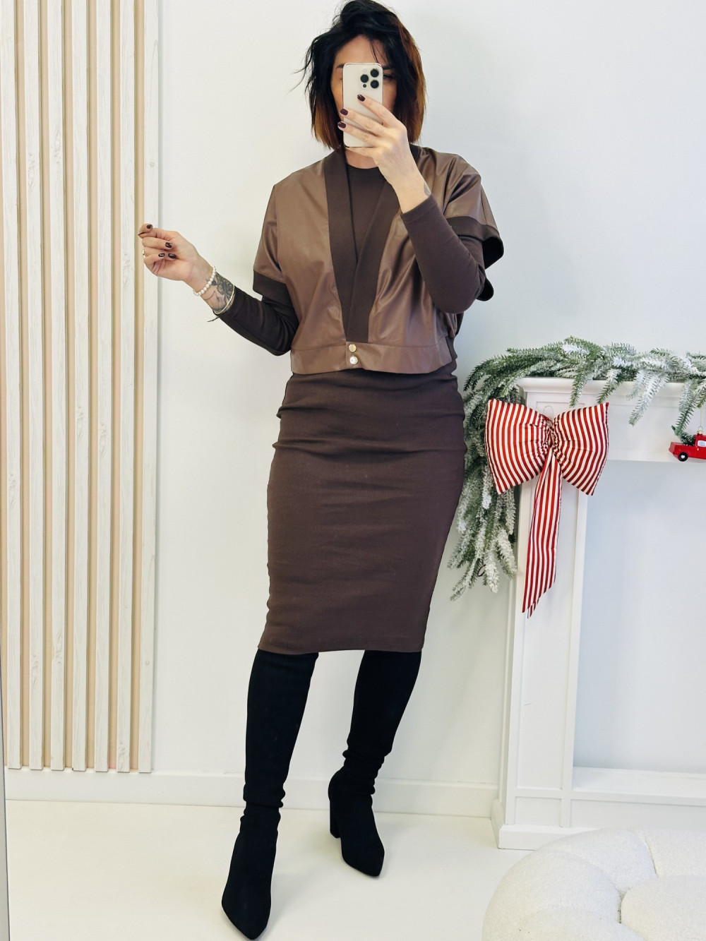 Brązowy komplet składający się z sukienki maxi z długim rękawem oraz lekkiej, a’la kurtki z krótkim rękawem to stylowa i niezwykle elegancka propozycja na każdą okazję. Sukienka pięknie podkreśla sylwetkę, a jej długość maxi dodaje całości klasy. Dopełnieniem zestawu jest krótka kurtka zapinana na dwa guziki, która nadaje stylizacji modnego, wyrafinowanego charakteru.