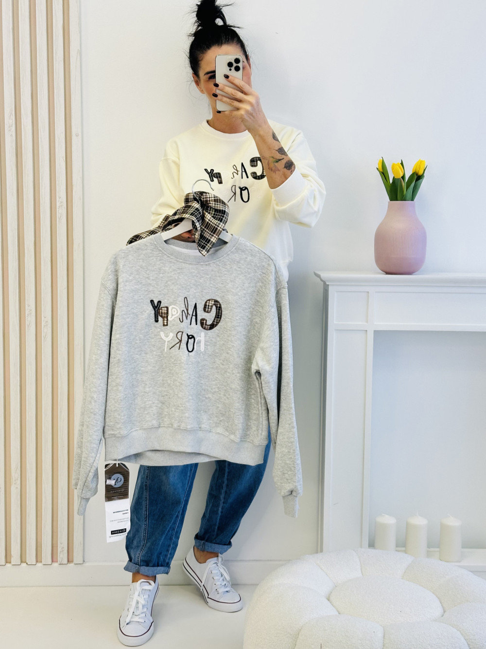 Bluza z długim rękawem z efektownym napisem na środku to stylowa propozycja w nowoczesnym wydaniu. Dodatkowa gumka w kratę nadaje całości oryginalnego charakteru. To idealny wybór do codziennych stylizacji, które łączą wygodę z modnym akcentem.