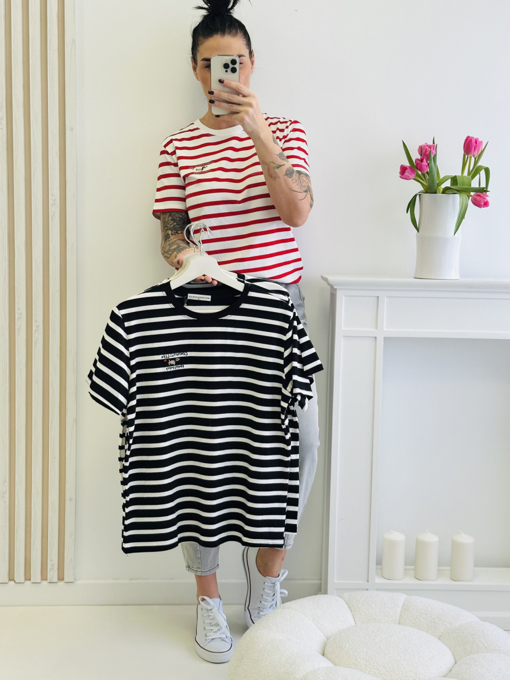 Bluzka w paski z krótkim rękawem, ozdobiona subtelną, małą aplikacją z przodu, to połączenie klasyki z uroczym akcentem. Lekki materiał i wygodny krój zapewniają komfort noszenia przez cały dzień. To idealna propozycja do codziennych stylizacji, która dodaje subtelnej elegancji i wyjątkowego charakteru.