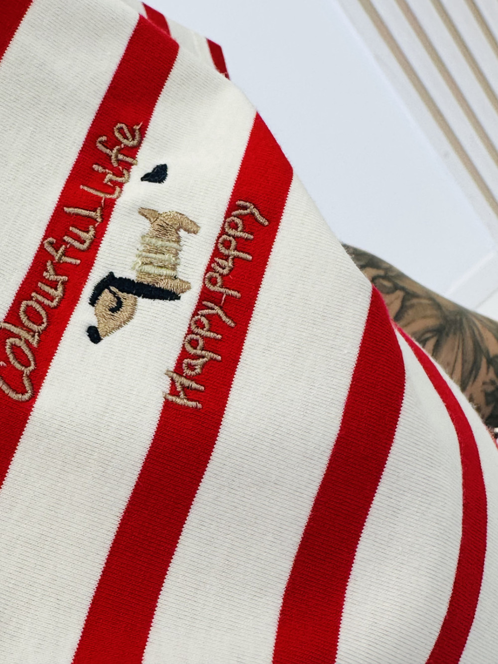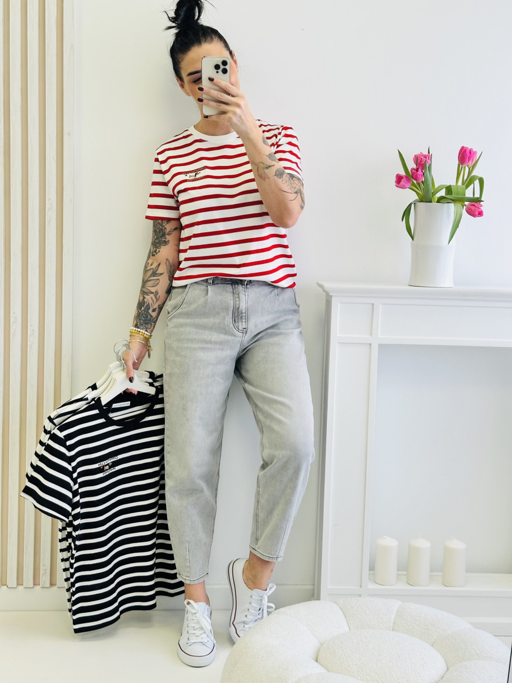 Bluzka w paski z krótkim rękawem, ozdobiona subtelną, małą aplikacją z przodu, to połączenie klasyki z uroczym akcentem. Lekki materiał i wygodny krój zapewniają komfort noszenia przez cały dzień. To idealna propozycja do codziennych stylizacji, która dodaje subtelnej elegancji i wyjątkowego charakteru.