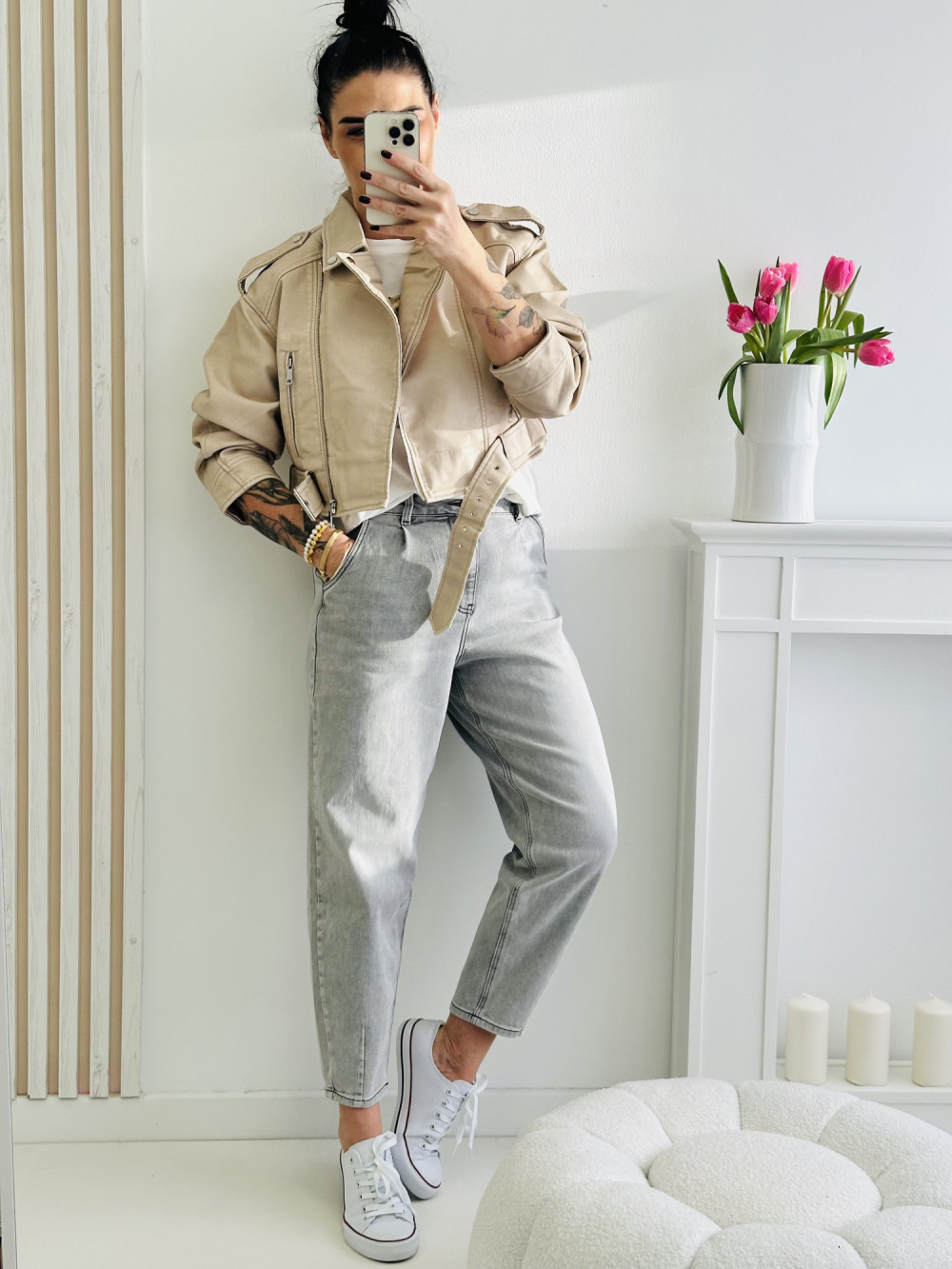 Beżowa krótka kurtka z długim rękawem to stylowa i uniwersalna propozycja na każdą porę roku. Zapinana na suwak, z praktycznymi kieszeniami z przodu oraz dodatkowym paskiem podkreślającym talię, łączy funkcjonalność z kobiecym designem. Doskonale uzupełni zarówno casualowe, jak i bardziej eleganckie stylizacje, dodając im klasy i lekkości.