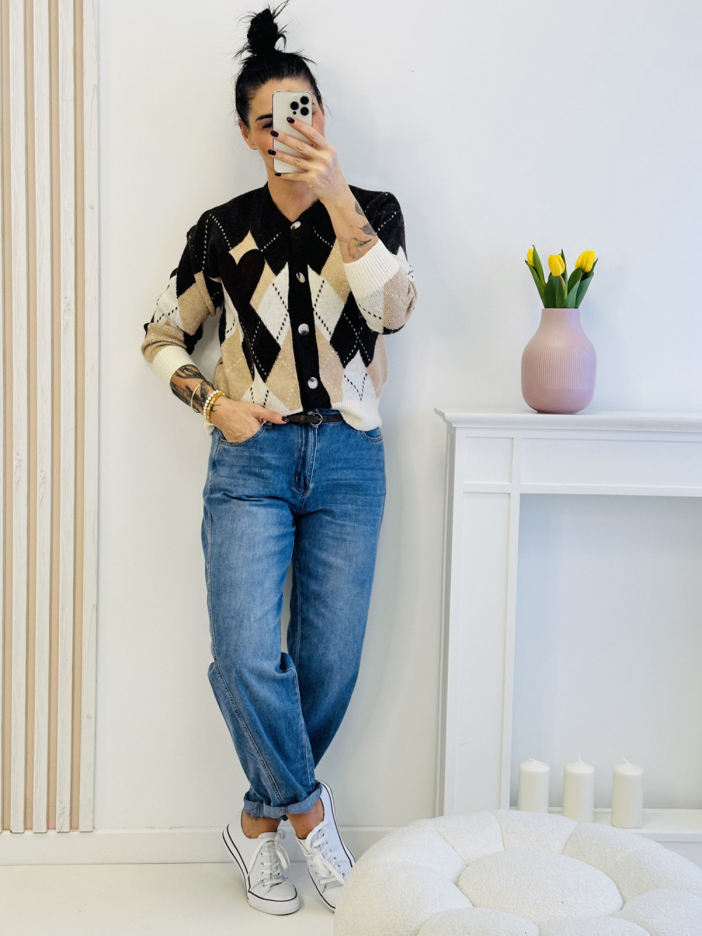 Brązowy sweter w romby to elegancka i przytulna propozycja na chłodniejsze dni. Zapinany na guziki, zachwyca klasycznym fasonem uzupełnionym o uroczy detal w postaci wyszytego brązowego serca z przodu. Miękki materiał zapewnia komfort noszenia, a stylowy wzór sprawia, że sweter doskonale dopełni zarówno codzienne, jak i bardziej kobiece stylizacje.