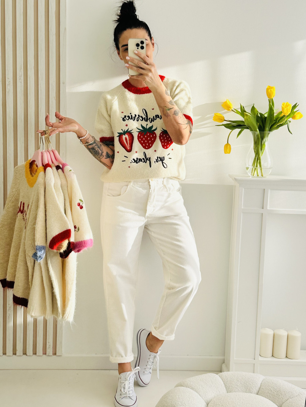 Sweter z krótkim rękawem z uroczą aplikacją w kształcie owoców to stylowa propozycja, która dodaje stylizacji świeżości i lekkości. Ozdobny detal z przodu przyciąga wzrok i nadaje całości dziewczęcego, modnego charakteru. Idealny do codziennych zestawów — świetnie komponuje się zarówno z jeansami, jak i spódnicą.