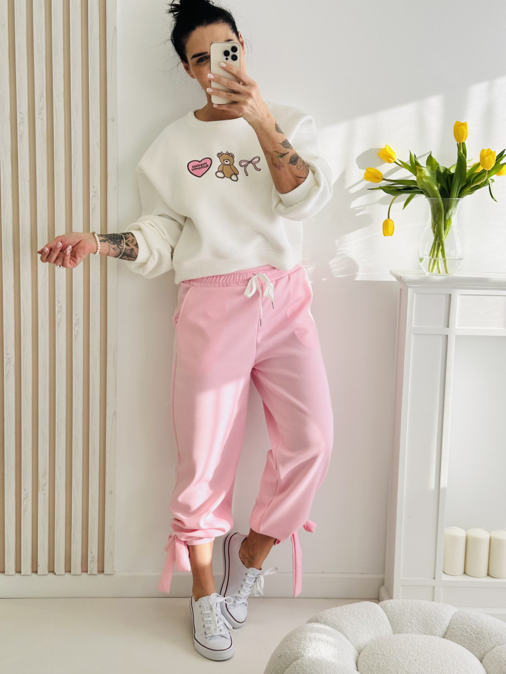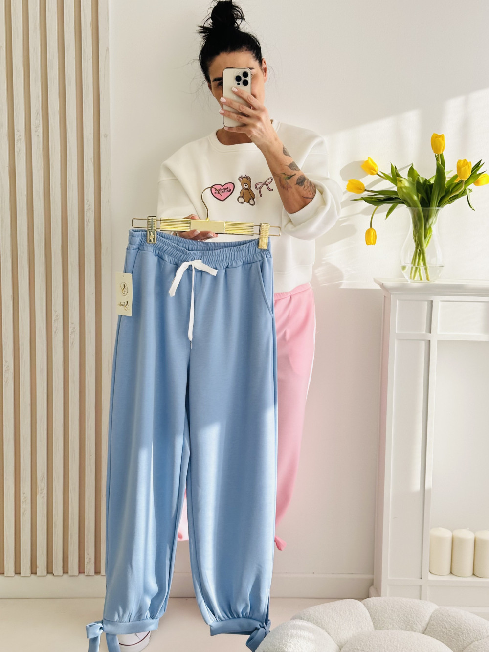 Eleganckie spodnie z gumką w pasie łączą wygodę z modnym detalem – praktyczne kieszenie i wiązania przy nogawkach na dole nadają im lekko sportowego, a zarazem stylowego charakteru. Miękki, przyjemny materiał zapewnia komfort noszenia przez cały dzień. Idealne do casualowych stylizacji, świetnie komponują się zarówno z bluzką, jak i lekkim swetrem.