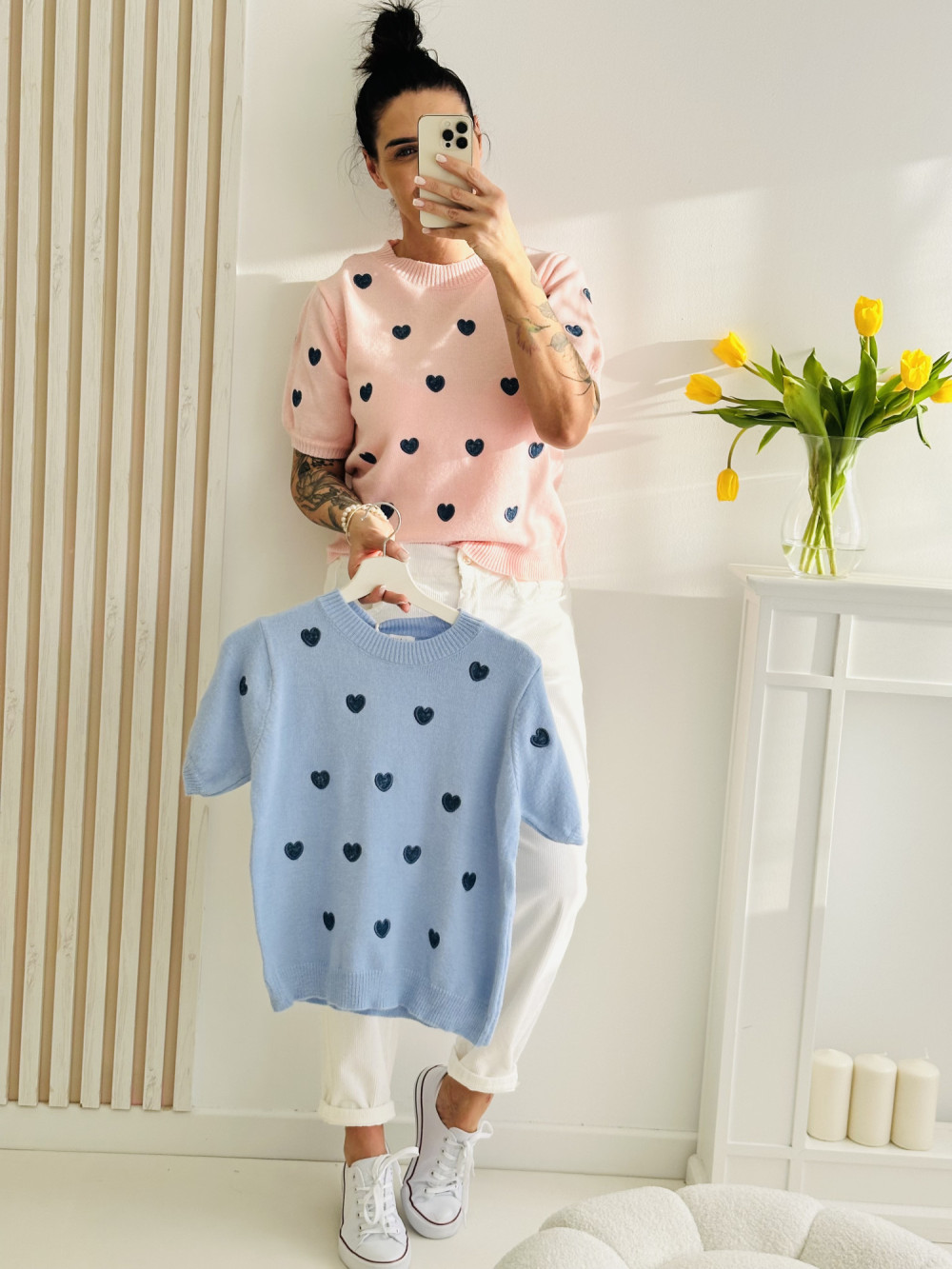 Niebieski sweter z krótkim rękawem, ozdobiony subtelnym wzorem ciemnoniebieskich serduszek, to idealne połączenie wygody i uroku. Lekki i przyjemny w dotyku materiał sprawia, że świetnie sprawdzi się zarówno na co dzień, jak i w bardziej stylowych zestawieniach. Krótki rękaw dodaje mu lekkości, a delikatny motyw serc podkreśla kobiecy charakter.