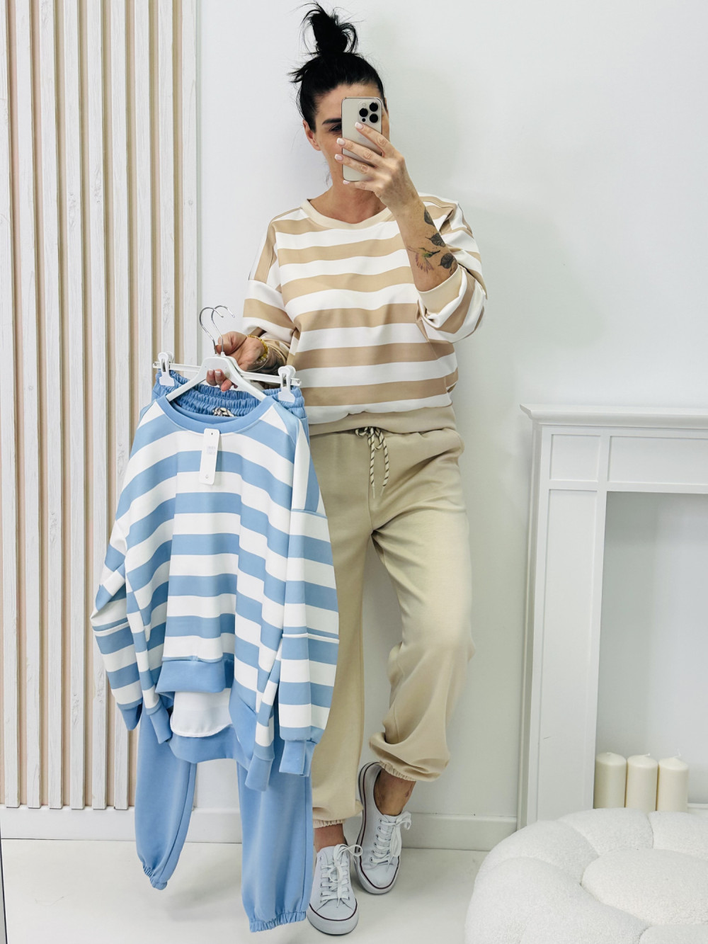 Stylowy komplet to idealne połączenie wygody i modnego wyglądu. Bluza w paski z długim rękawem nadaje całości nowoczesnego charakteru, a spodnie z elastyczną gumką w pasie zapewniają komfort noszenia przez cały dzień. Gładkie spodnie z praktycznymi kieszeniami doskonale równoważą wzór bluzy, tworząc spójną i uniwersalną stylizację na co dzień.