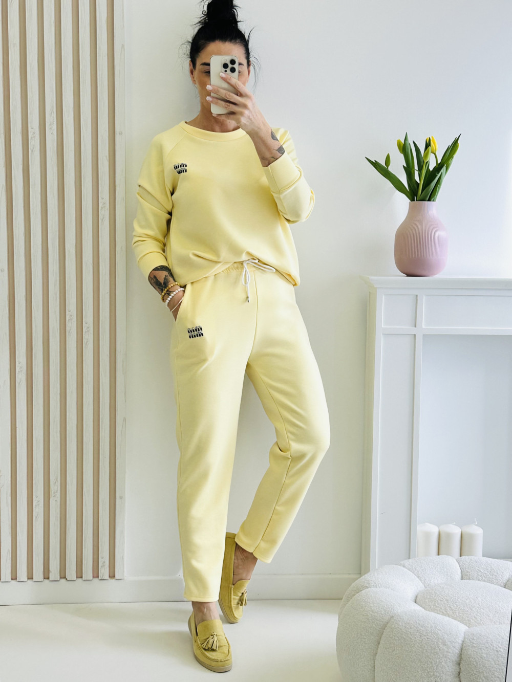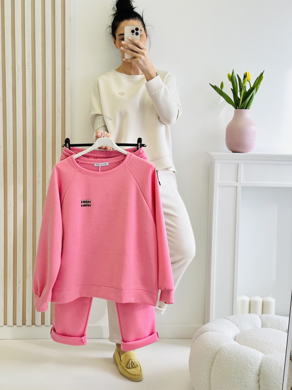 Stylowy komplet to idealne połączenie komfortu i nowoczesnego minimalizmu. Bluza z długim rękawem, ozdobiona subtelnym napisem z przodu, nadaje całości modnego charakteru. Spodnie z gumką w pasie, praktycznymi kieszeniami oraz delikatnym napisem z przodu doskonale dopełniają zestaw, tworząc wygodną i spójną stylizację na co dzień.