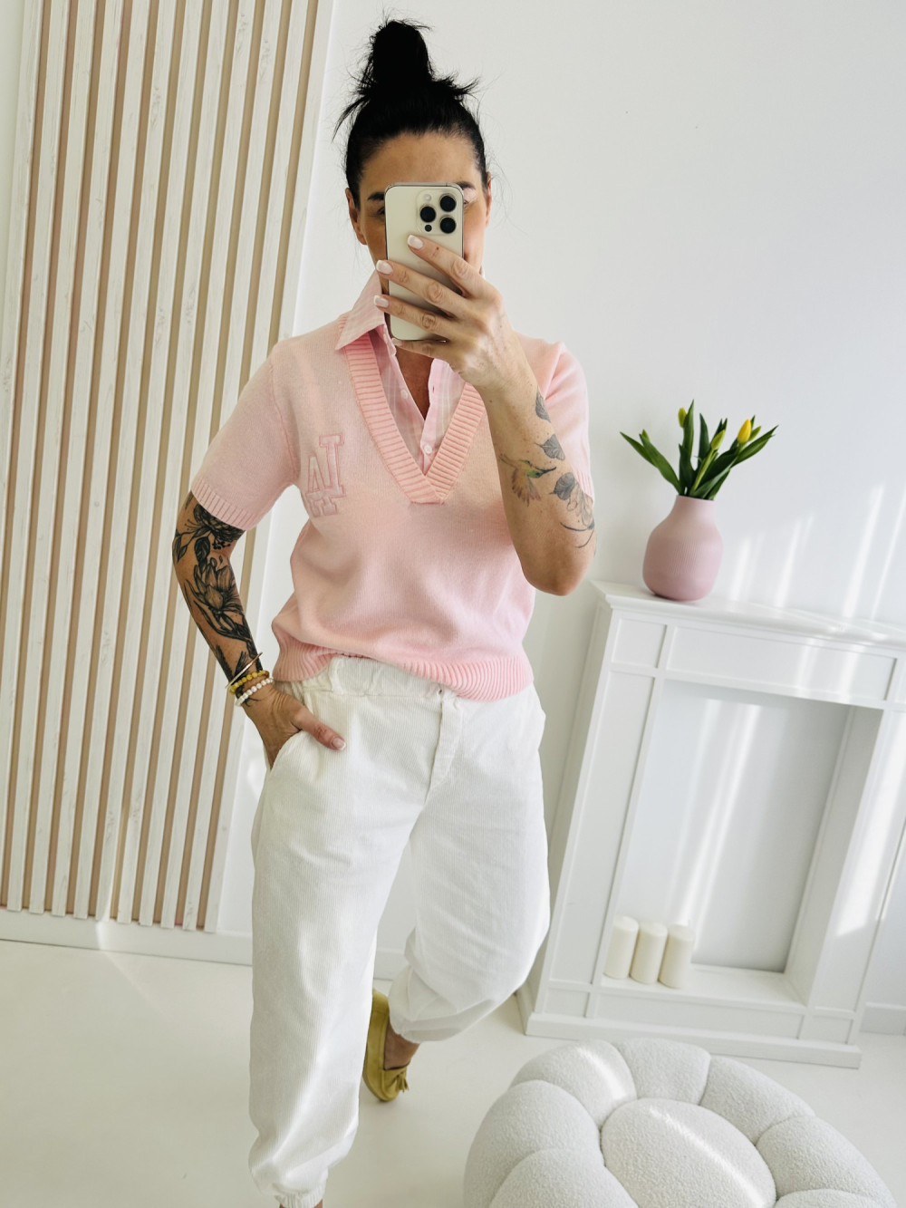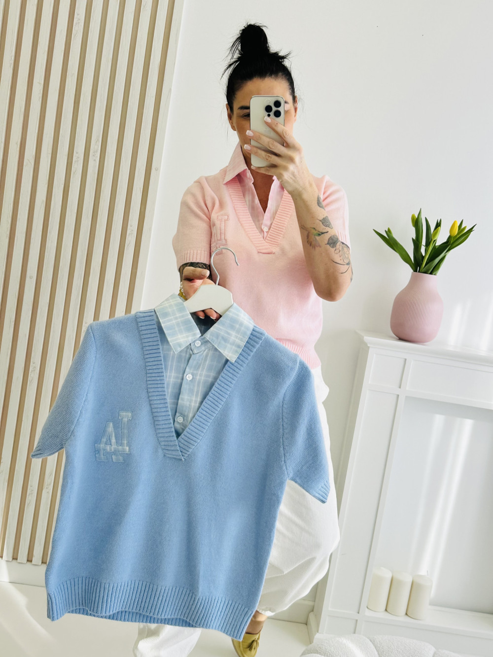 Sweter z krótkim rękawem z elegancką wstawką koszulową przy dekolcie to stylowe połączenie klasyki i nowoczesności. Kontrastowy detal nadaje całości szyku i sprawia, że model wygląda jak modna stylizacja „2 w 1”. Wygodny krój i przyjemny w dotyku materiał czynią go idealnym wyborem zarówno na co dzień, jak i do bardziej eleganckich zestawów.