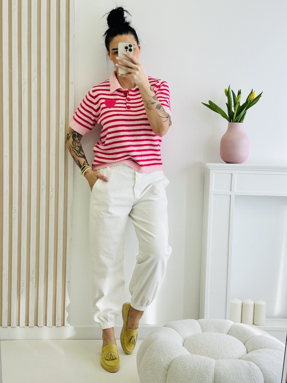 Sweter z krótkim rękawem i kołnierzykiem w paski to stylowa propozycja łącząca klasykę z nowoczesnym designem. Subtelny wzór w paski nadaje mu świeżości i lekkości, a elegancki kołnierzyk podkreśla kobiecy charakter całości. Miękki materiał i wygodny krój sprawiają, że sweter doskonale sprawdzi się zarówno w codziennych, jak i bardziej eleganckich stylizacjach.