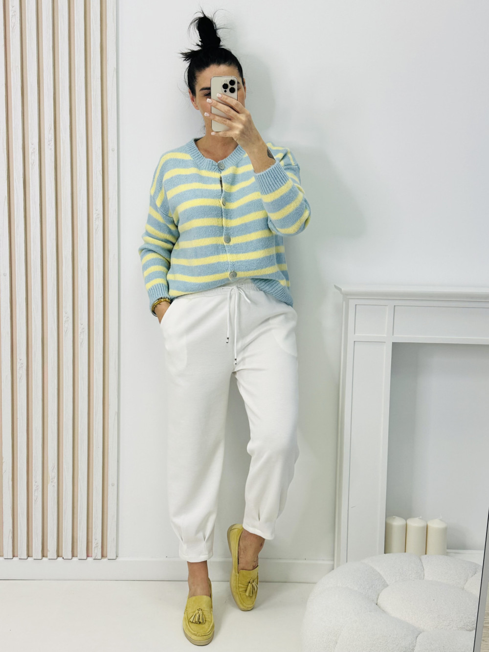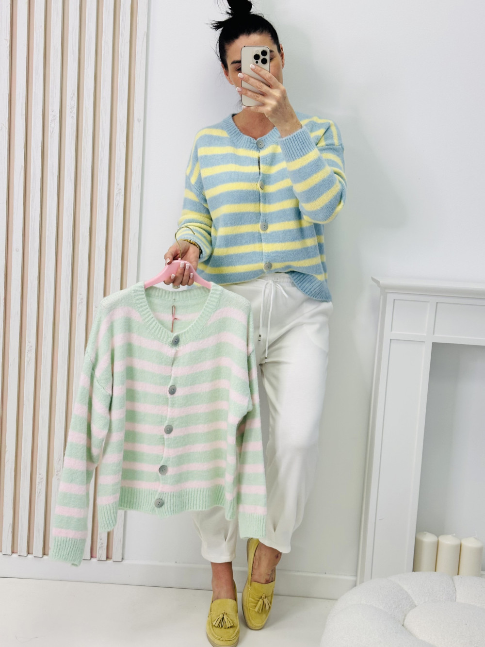 Sweter z długim rękawem zapinany na guziki w paski to połączenie klasyki z modnym, ponadczasowym wzorem. Delikatny pasek nadaje mu lekkości i świeżego charakteru, a praktyczne zapięcie na guziki pozwala na swobodne dopasowanie do stylizacji. Miękki, przyjemny w dotyku materiał i starannie skrojony fason sprawiają, że sweter doskonale sprawdzi się zarówno na co dzień, jak i w bardziej eleganckich zestawach.