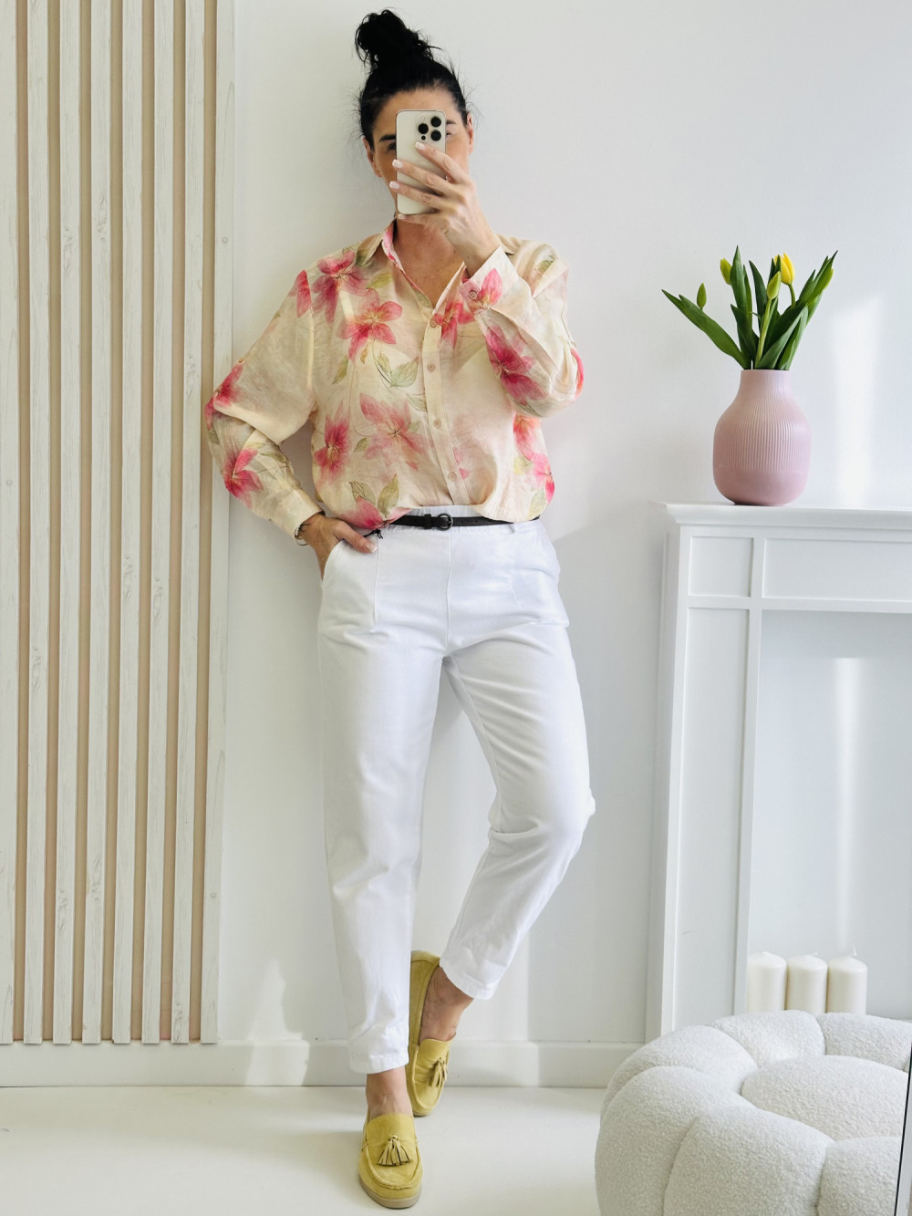 Delikatna koszula w kwiaty z długim rękawem to kobieca i lekka propozycja na każdą okazję. Zapinana na guziki, łączy klasyczny fason z subtelnym, romantycznym wzorem kwiatowym, który dodaje świeżości i elegancji. Wykonana z przyjemnego w dotyku materiału, zapewnia komfort noszenia przez cały dzień.