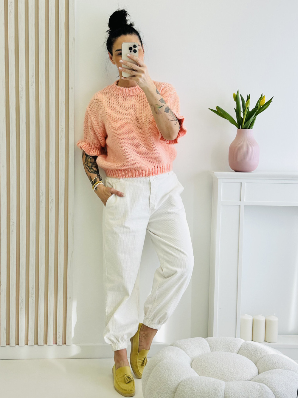 Pomarańczowy sweter z krótkim rękawem to energetyczna i wyjątkowa propozycja do codziennych stylizacji. Oryginalne zakończenie dodaje mu niepowtarzalnego charakteru i nowoczesnego wyglądu. Miękki, przyjemny w dotyku materiał oraz wygodny fason sprawiają, że sweter łączy komfort z modnym stylem.