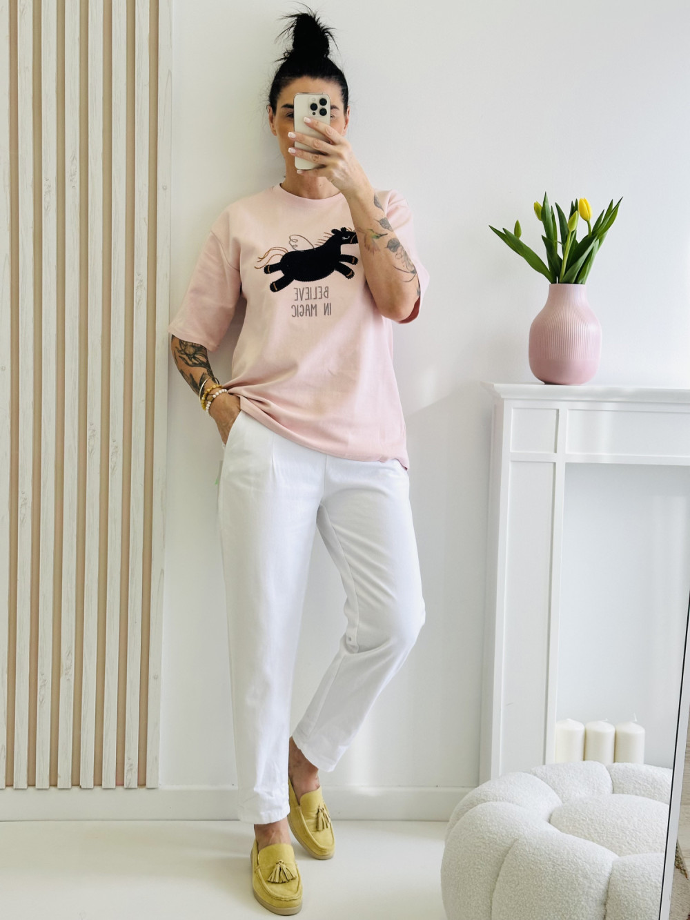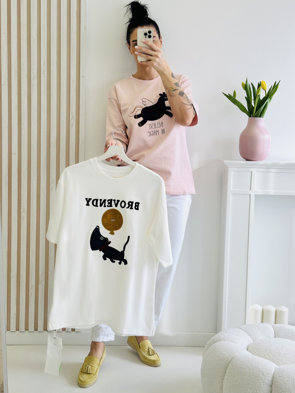 Bluzka z krótkim rękawem z aplikacją zwierzęcia na środku to urocza i przyciągająca uwagę propozycja. Subtelny motyw dodaje jej wyjątkowego charakteru i odrobiny zabawy w codziennych stylizacjach. Wykonana z miękkiego, przyjemnego w dotyku materiału, łączy komfort noszenia z modnym wyglądem.
