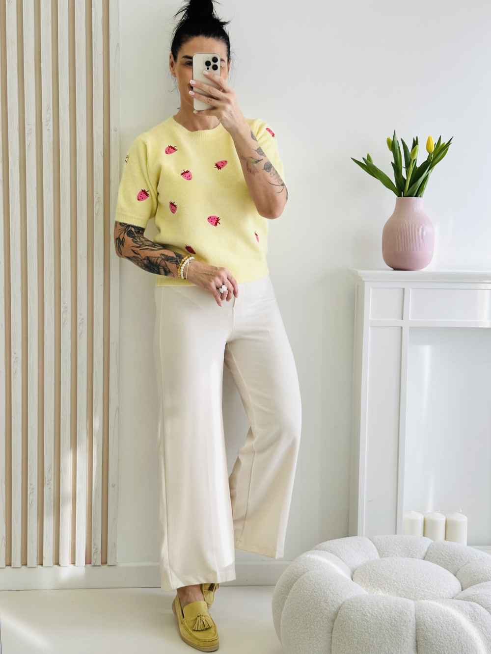 Eleganckie kremowe spodnie z gumką w pasie to idealne połączenie stylu i wygody. Elastyczna talia zapewnia komfort noszenia i doskonałe dopasowanie. Klasyczny kolor i staranny fason sprawiają, że spodnie świetnie sprawdzą się zarówno w codziennych, jak i bardziej eleganckich stylizacjach.
