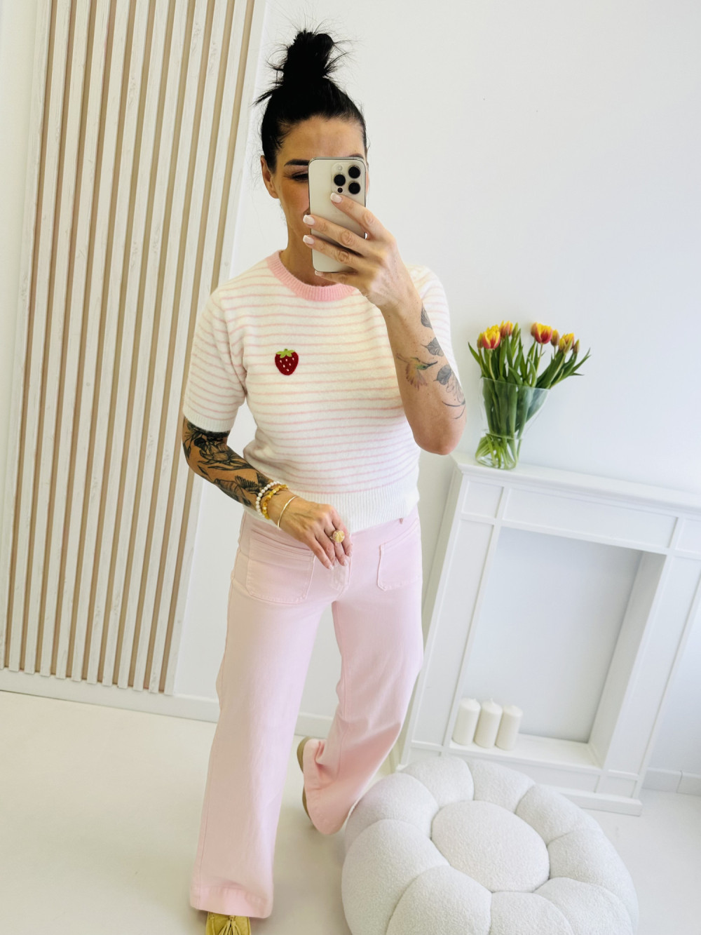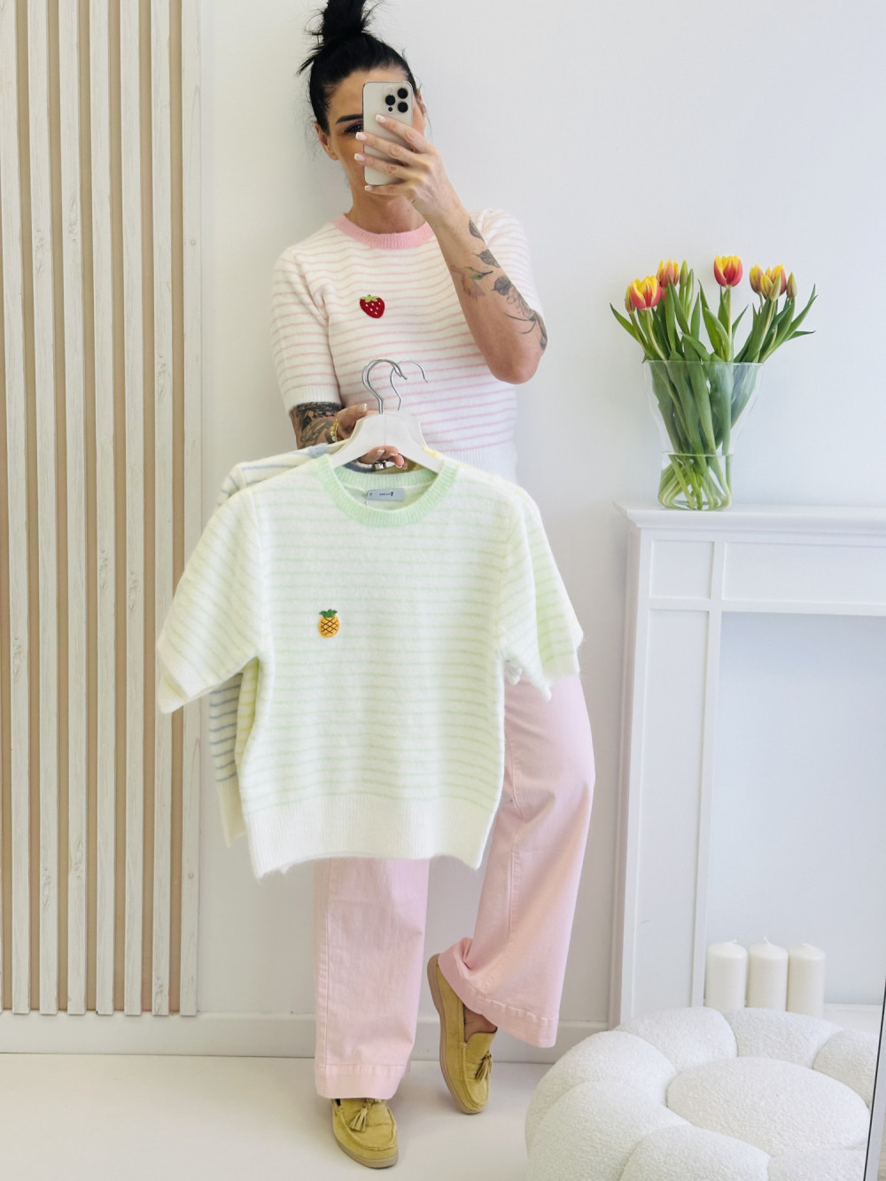 Sweter w paski z krótkim rękawem to stylowa propozycja na każdą porę roku. Uroku dodaje mu subtelna aplikacja owoców umieszczona na przodzie, która nadaje całości kobiecego i romantycznego charakteru. Miękki, przyjemny w dotyku materiał oraz wygodny krój sprawiają, że sweter doskonale sprawdzi się w codziennych stylizacjach.