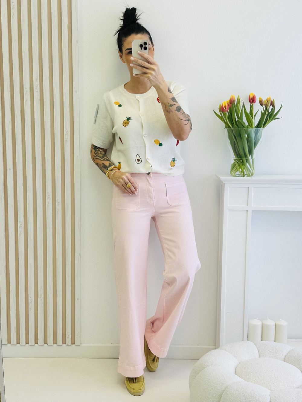 Sweter w owocki z krótkim rękawem to urocza i pełna świeżości propozycja na wiosnę i lato. Zapinany na guziki, łączy klasyczny fason z radosnym, kolorowym wzorem, który przyciąga spojrzenia. Miękki, lekki materiał zapewnia komfort noszenia, a całość doskonale dopełni codzienne stylizacje z nutą zabawy i dziewczęcego uroku.
