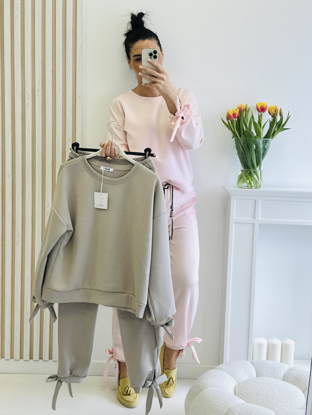 Stylowy komplet to idealne połączenie wygody i nowoczesnego designu. Bluza z długim rękawem, ozdobiona wiązaniem przy dole rękawów, nadaje całości modnego i oryginalnego charakteru. Spodnie z elastyczną gumką w pasie, praktycznymi kieszeniami oraz wiązaniem na dole nogawek zapewniają komfort noszenia i tworzą spójną, stylową całość na co dzień.
