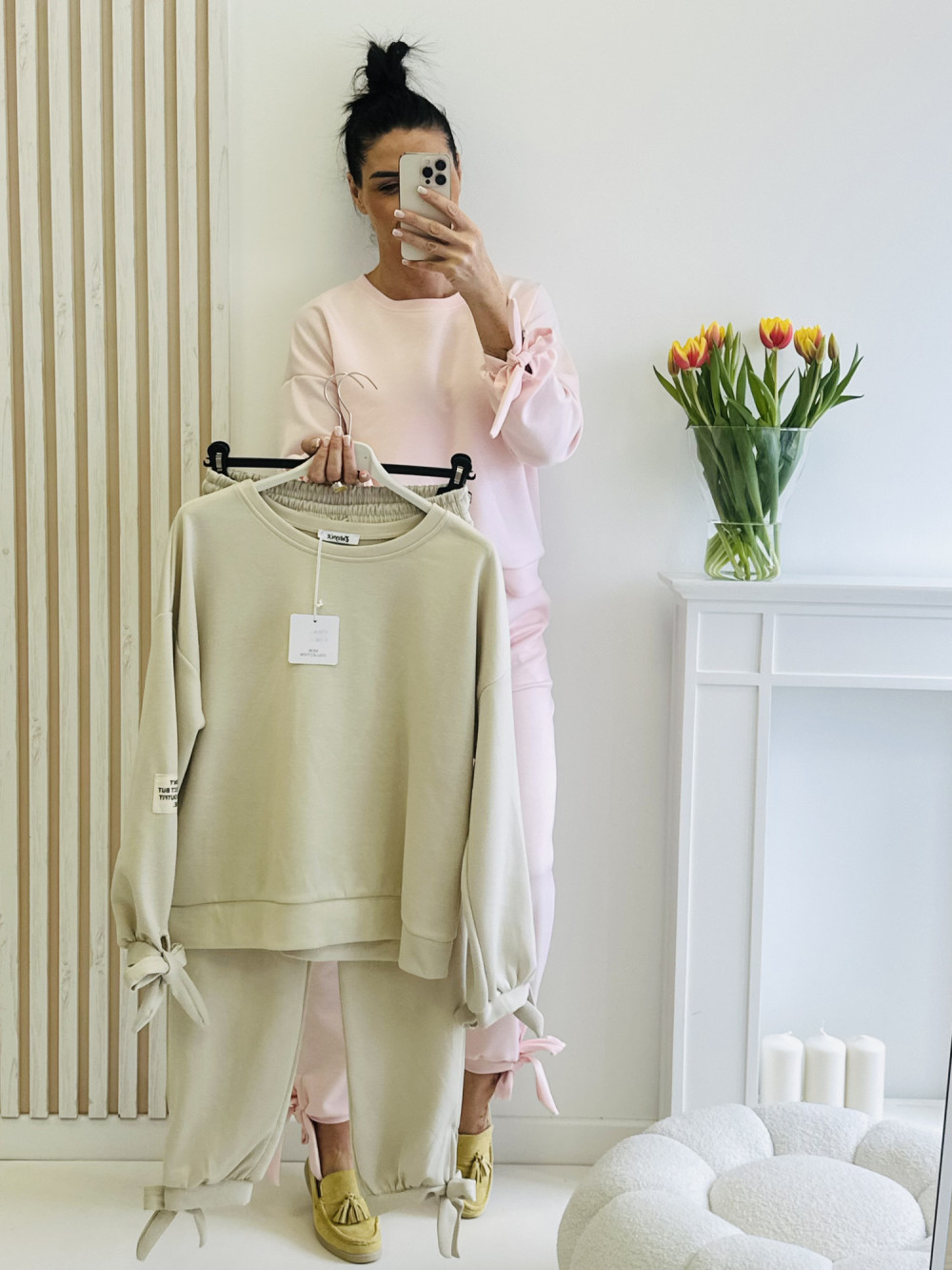 Stylowy komplet to idealne połączenie wygody i nowoczesnego designu. Bluza z długim rękawem, ozdobiona wiązaniem przy dole rękawów, nadaje całości modnego i oryginalnego charakteru. Spodnie z elastyczną gumką w pasie, praktycznymi kieszeniami oraz wiązaniem na dole nogawek zapewniają komfort noszenia i tworzą spójną, stylową całość na co dzień.