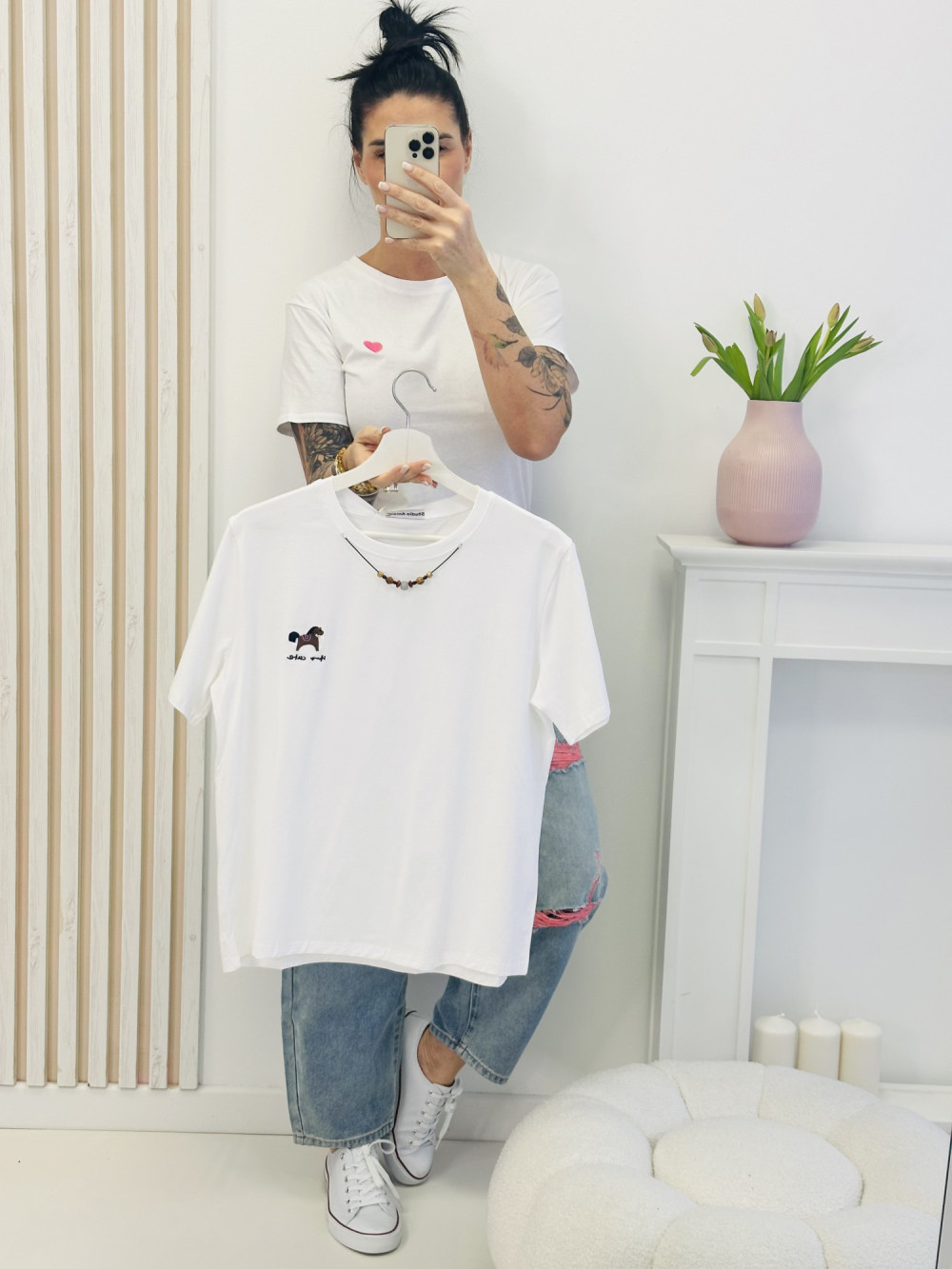 Biała bluzka z krótkim rękawem to ponadczasowa baza w każdej garderobie. Subtelna, mała aplikacja oraz przyczepiony naszyjnik z przodu dodają jej delikatnego charakteru i modnego akcentu. Wykonana z miękkiego, przyjemnego w dotyku materiału, zapewnia komfort noszenia i świetnie sprawdzi się w codziennych stylizacjach.