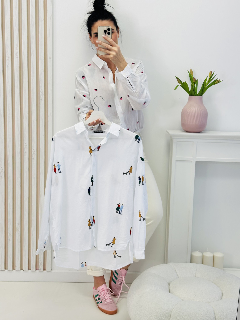 Biała koszula z długim rękawem, zapinana na guziki, to klasyka w wyjątkowo uroczym wydaniu. Małe, subtelne aplikacje rozmieszczone na materiale dodają jej lekkości i dziewczęcego charakteru. Elegancki fason w połączeniu z delikatnymi detalami sprawia, że koszula doskonale sprawdzi się zarówno w codziennych, jak i bardziej stylowych stylizacjach.