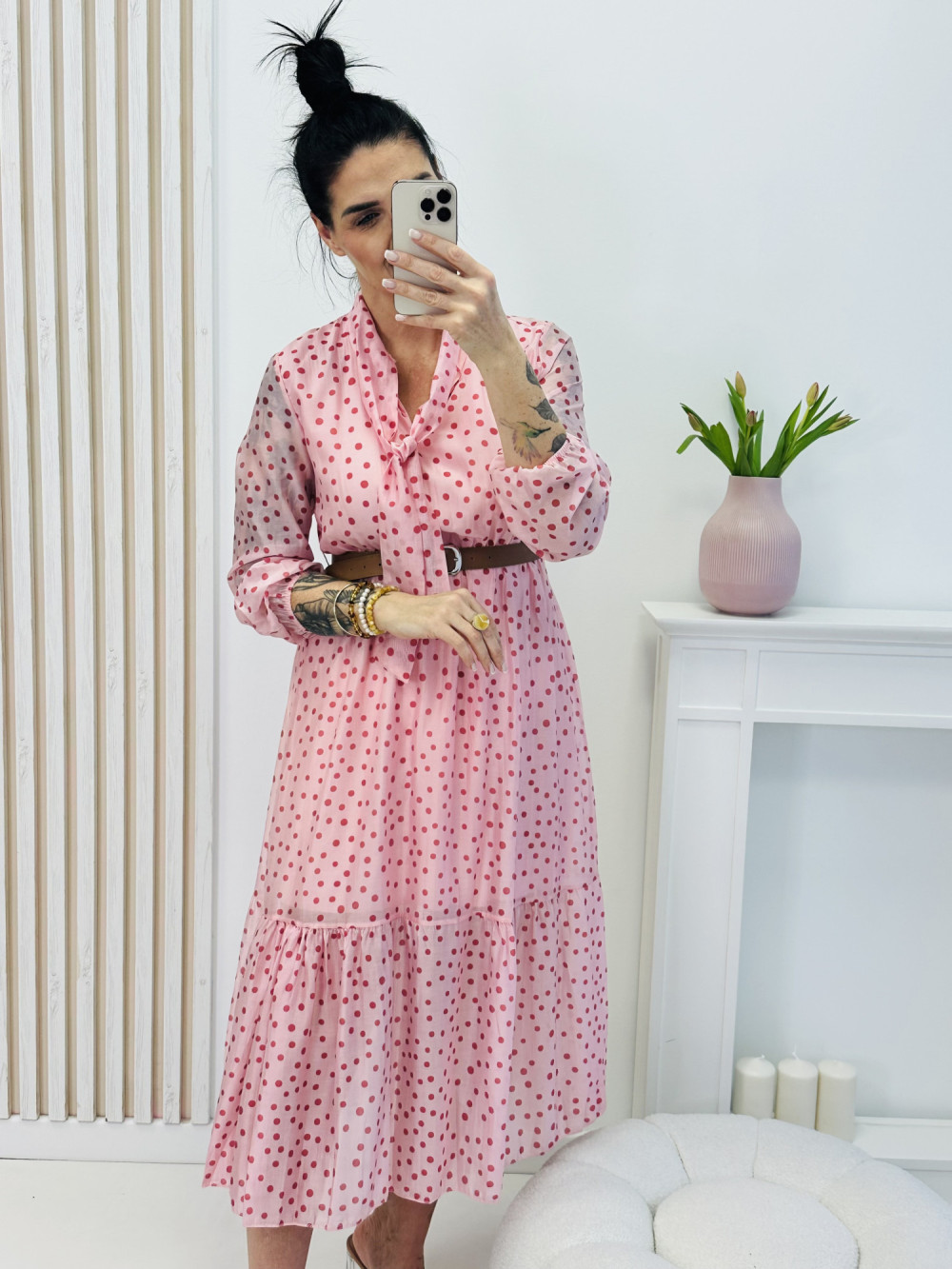Różowa sukienka w kropki z długim rękawem oraz dodatkowym paskiem to urocza i kobieca propozycja na każdą okazję. Delikatne wiązanie przy dekolcie dodaje subtelnej elegancji, a gumka w pasie podkreśla sylwetkę, zapewniając komfort noszenia. Lekki, przyjemny w dotyku materiał oraz ponadczasowy wzór w kropki sprawiają, że sukienka doskonale sprawdzi się w codziennych i bardziej wyjątkowych stylizacjach.