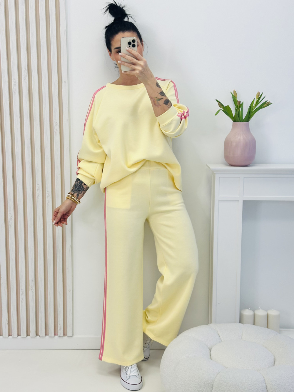 Stylowy komplet łączy wygodę z modnym, sportowym designem. Bluza z długim rękawem ozdobiona dwoma paskami na rękawach nadaje całości dynamicznego charakteru, a spodnie z gumką w pasie, praktycznymi kieszeniami i lampasami idealnie dopełniają zestaw. Miękki, przyjemny w dotyku materiał oraz dopracowany fason sprawiają, że komplet doskonale sprawdzi się w codziennych i aktywnych stylizacjach.