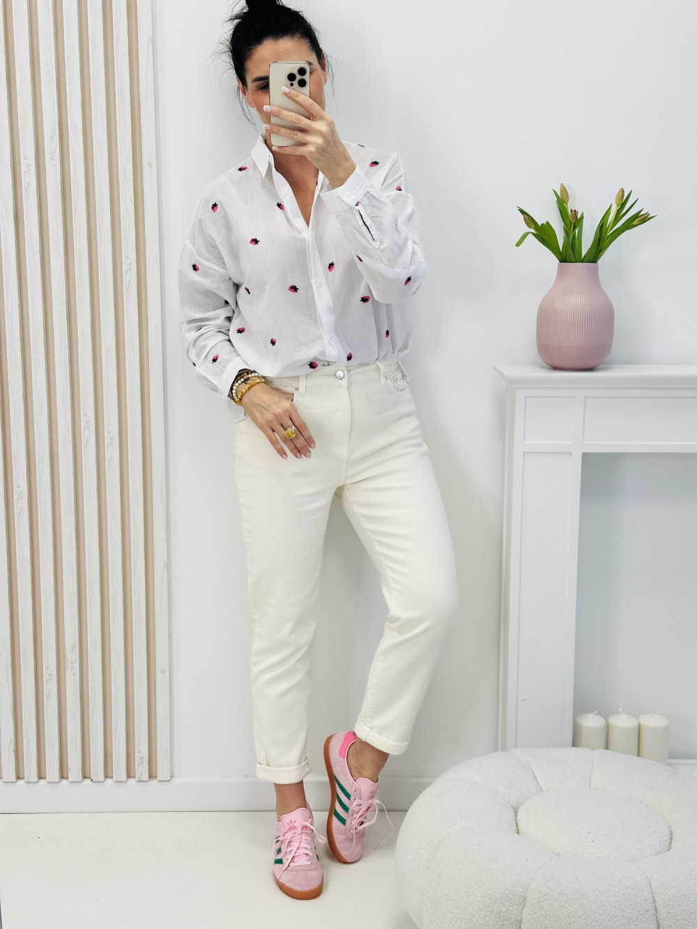 Kremowe spodnie jeansowe to elegancka i uniwersalna propozycja, która doda lekkości każdej stylizacji. Wyposażone w praktyczne kieszenie, łączą wygodę z klasycznym, ponadczasowym fasonem. Doskonale sprawdzą się zarówno w codziennych, casualowych zestawach, jak i w bardziej dopracowanych, stylowych lookach.