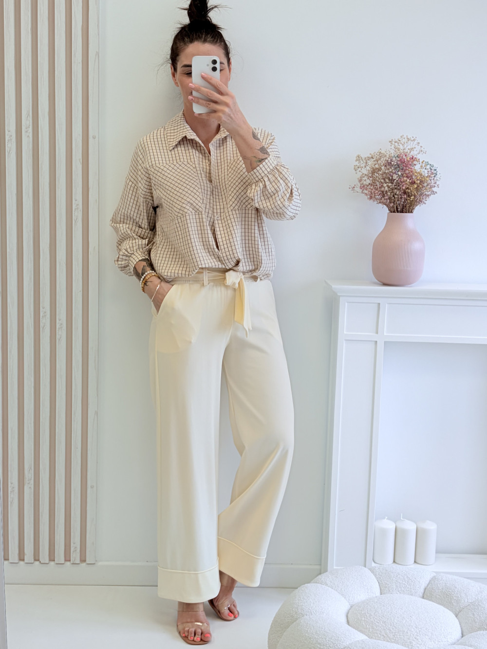 Beżowa koszula w kratkę z długim rękawem to ponadczasowa propozycja, która łączy klasykę z codzienną wygodą. Zapinana na guziki, prezentuje się stylowo i uniwersalnie, pasując do wielu stylizacji. Przyjemny w dotyku materiał oraz starannie skrojony fason sprawiają, że koszula doskonale sprawdzi się zarówno na co dzień, jak i w bardziej casualowych zestawach.