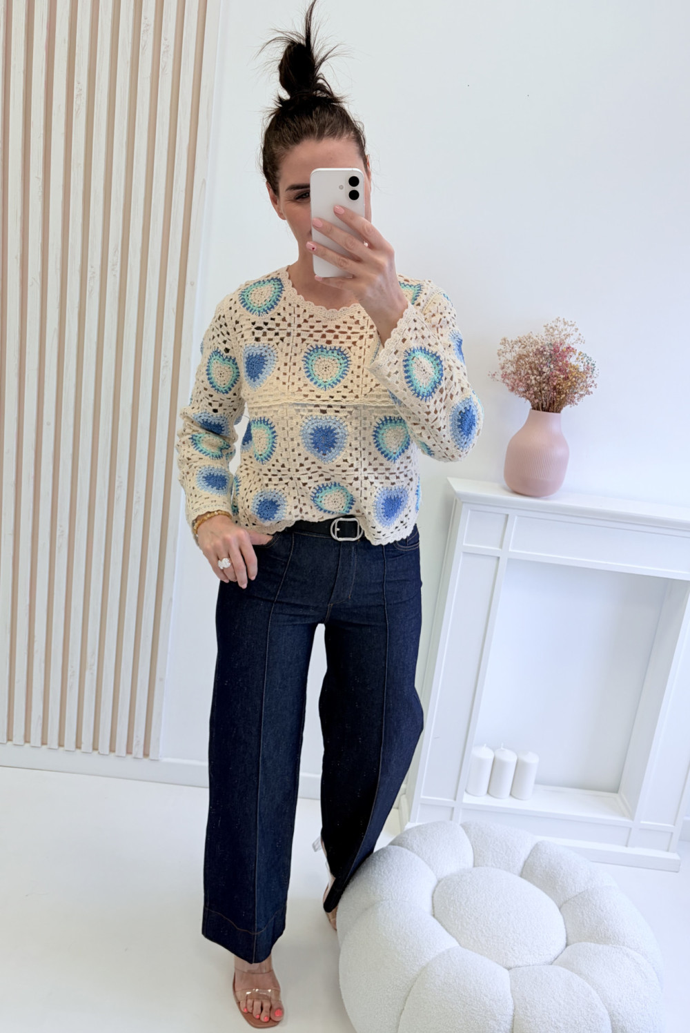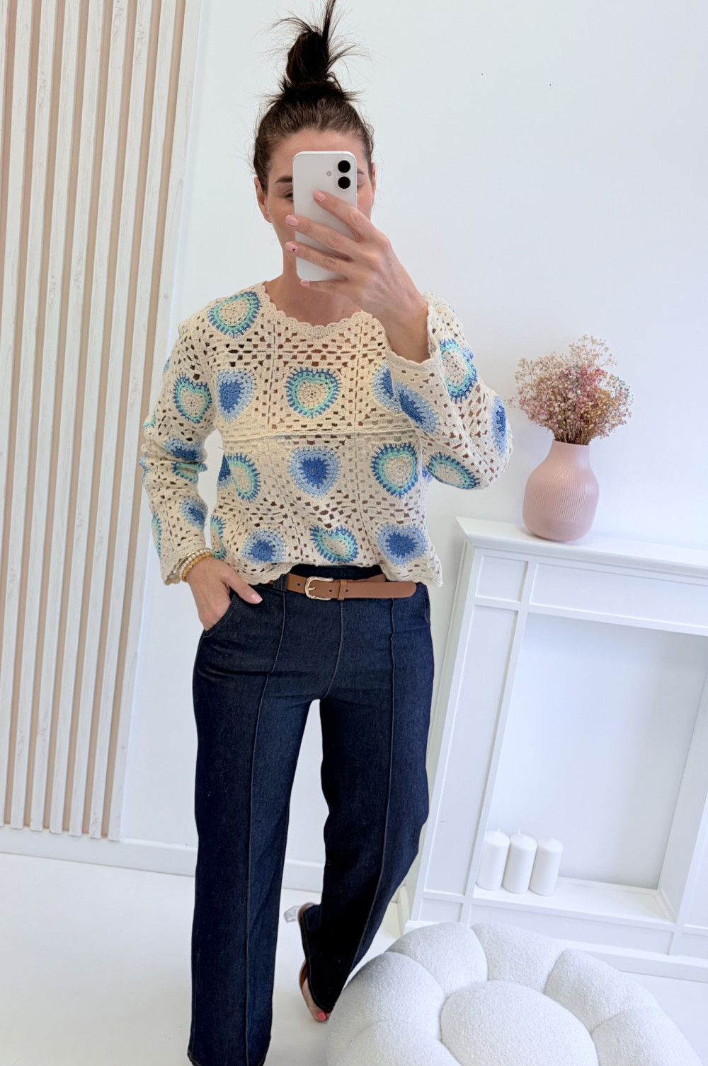 Beżowo-niebieski sweter to idealna propozycja na letnie dni i nadmorskie spacery. Lekka dzianina z długim rękawem chroni przed chłodniejszym wiatrem, a różnorodne wzory nadają całości wakacyjnego, swobodnego charakteru. Stylowy i komfortowy, doskonale sprawdzi się jako narzutka na plażę lub element letnich, casualowych stylizacji.