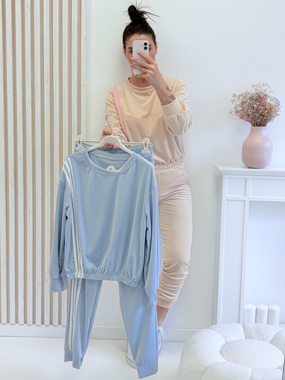 Ażurowy komplet to stylowa i lekka propozycja, idealna na wiosenne i letnie dni. Bluza z długim rękawem ozdobiona lampasami z przodu nadaje całości nowoczesnego charakteru, jednocześnie zachowując subtelną elegancję. Spodnie z gumką w pasie, praktycznymi kieszeniami oraz dopasowanymi lampasami z przodu zapewniają wygodę noszenia i tworzą spójną, modną stylizację.