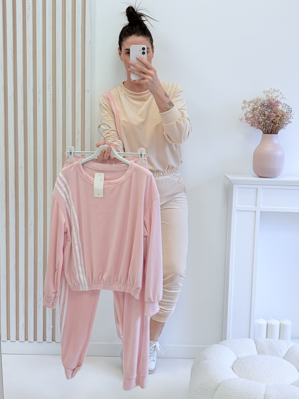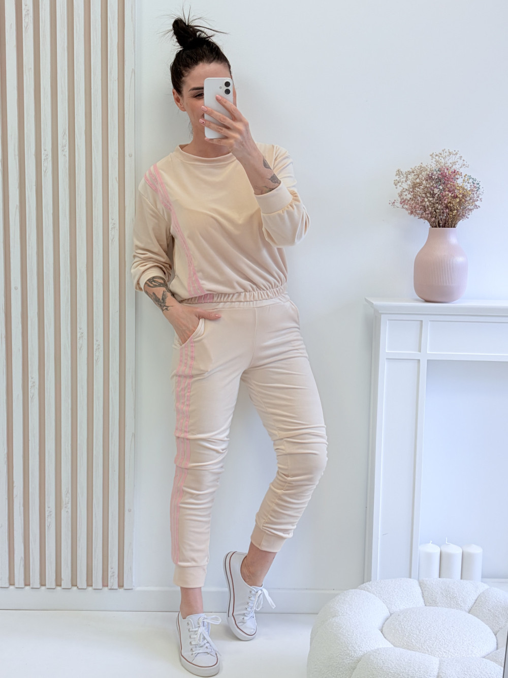 Ażurowy komplet to stylowa i lekka propozycja, idealna na wiosenne i letnie dni. Bluza z długim rękawem ozdobiona lampasami z przodu nadaje całości nowoczesnego charakteru, jednocześnie zachowując subtelną elegancję. Spodnie z gumką w pasie, praktycznymi kieszeniami oraz dopasowanymi lampasami z przodu zapewniają wygodę noszenia i tworzą spójną, modną stylizację.