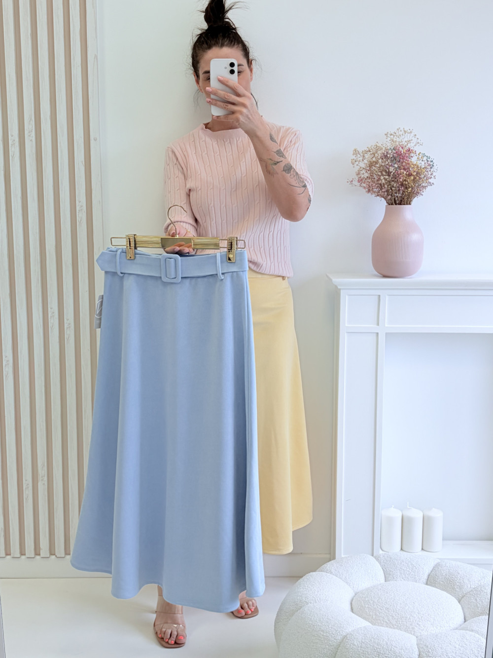 Spódnica z gumką w pasie to wygodna i elegancka propozycja na co dzień. Elastyczna talia zapewnia komfort noszenia, a dodatkowy pasek w kolorze spódnicy subtelnie podkreśla sylwetkę i nadaje całości spójnego, stylowego charakteru. Uniwersalny fason sprawia, że spódnica doskonale sprawdzi się zarówno w codziennych, jak i bardziej eleganckich stylizacjach.