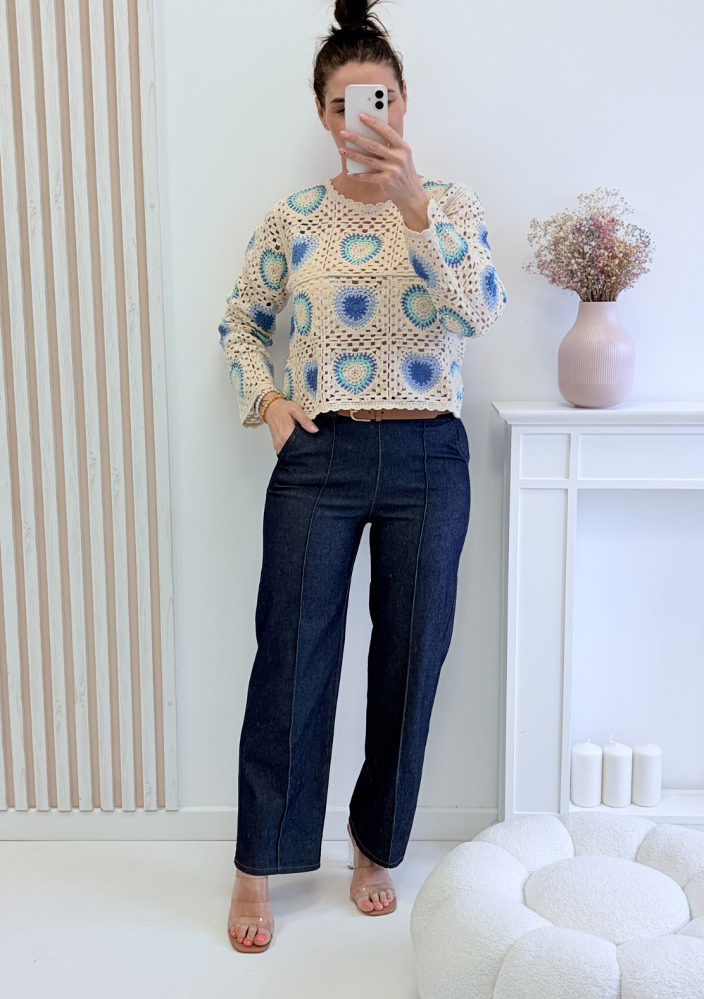 Ciemnoniebieskie spodnie jeansowe to klasyczna i elegancka propozycja do każdej garderoby. Wyposażone w praktyczne kieszenie oraz dodatkowy brązowy pasek, który stylowo podkreśla talię i dodaje całości charakteru. Uniwersalny fason sprawia, że spodnie doskonale sprawdzą się zarówno w codziennych, jak i bardziej eleganckich stylizacjach.